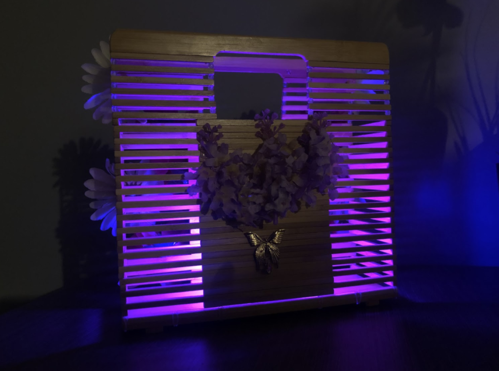 The purse is so cool. It looks like it could be both a lantern and a vase to hold flowers. The purple light makes the purse look like it glowing from the inside.