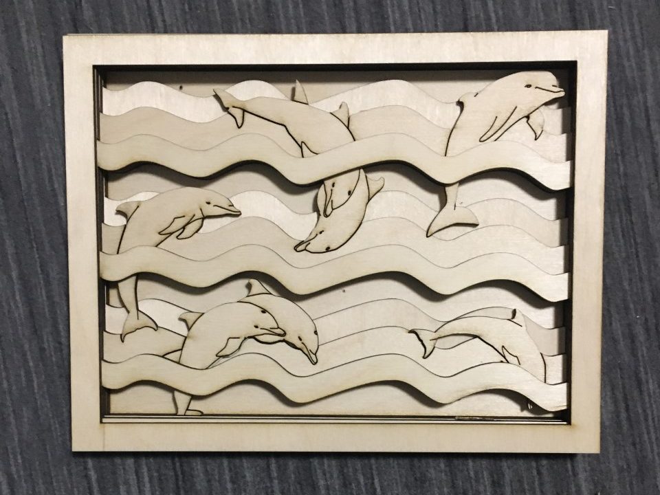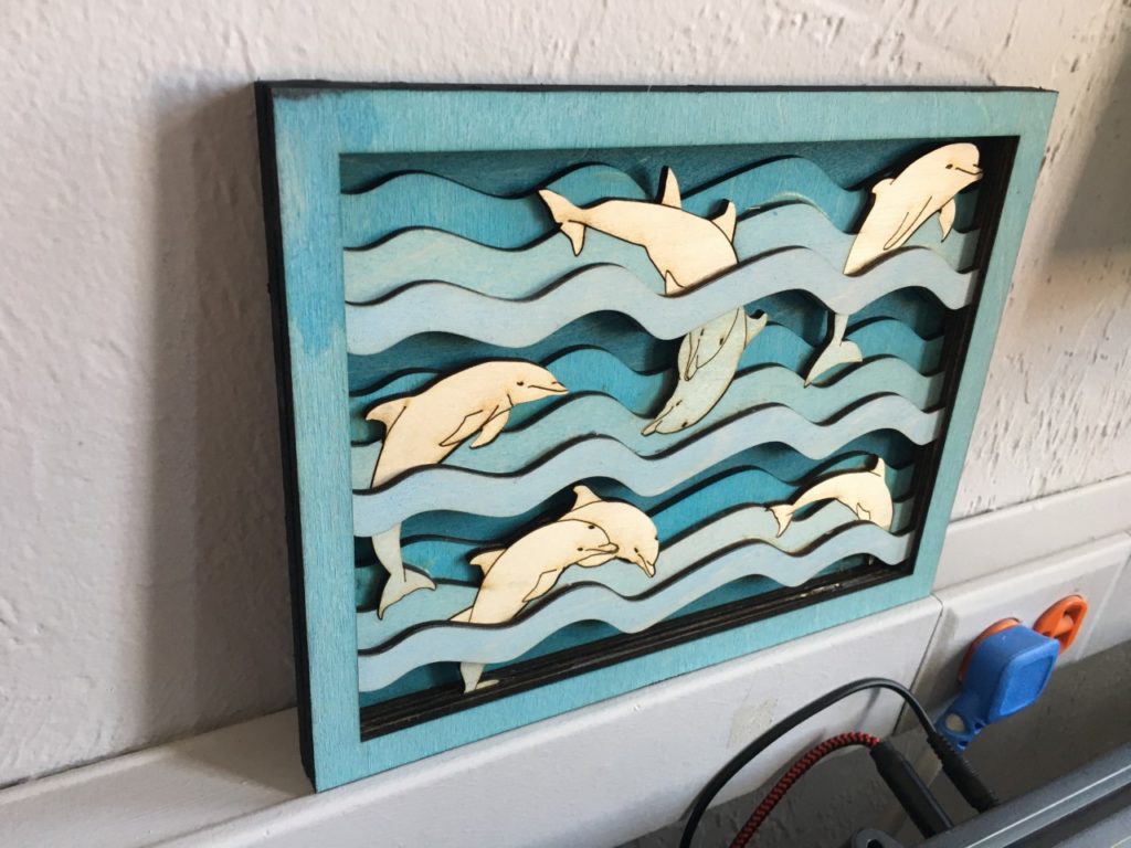 I finished the cuts last night and painted them, I ended up painting the parts of the dolphins that were below water light blue so you could tell they were underwater, and made the frame a blue shade as well since the natural wood color was super distracting from the dolphins.