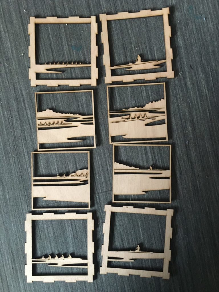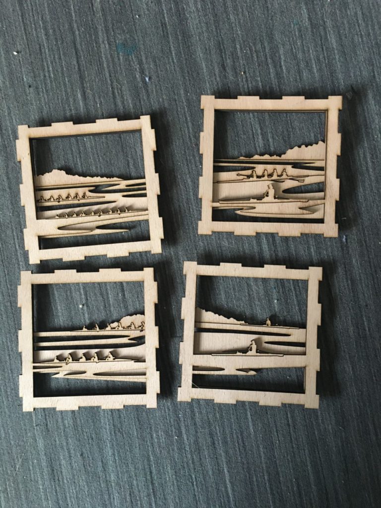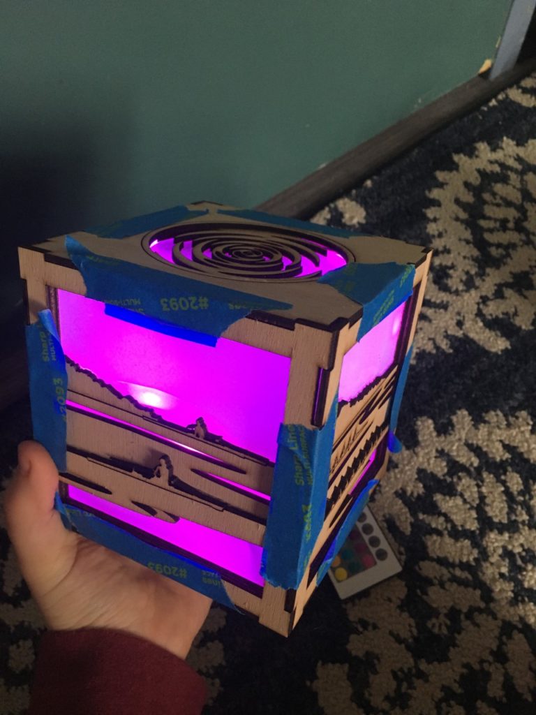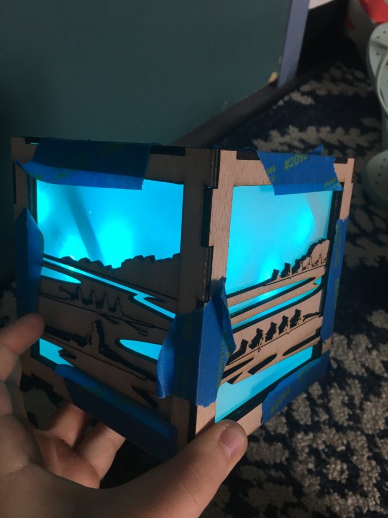 For this project I was really inspired by a bunch of sunset rowing pics my friends reminded me of. I decided to do a normal 5″ cube box shape, but each side of the box has two layers to try to add a little more depth to each scene. I’m using colored LEDs for the lighting inside because I like the idea of having sunset colors or just daytime blue in the sky and reflected in the water. I had a lot of trouble deciding what to draw for the top so I just went for a water ripples design.