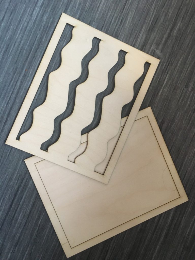 I was having issues downloading my svg files onto the computer and connecting with the laser, which unfortunately cut into a lot of my time today. I got the first two cuts done out of 5 (the backing and the first set of waves); the next reservation I could get was Saturday night so hopefully I can finish them all up then! I’m using 1/8″ birch and I ended up needing 6 passes at 20% to cut through.