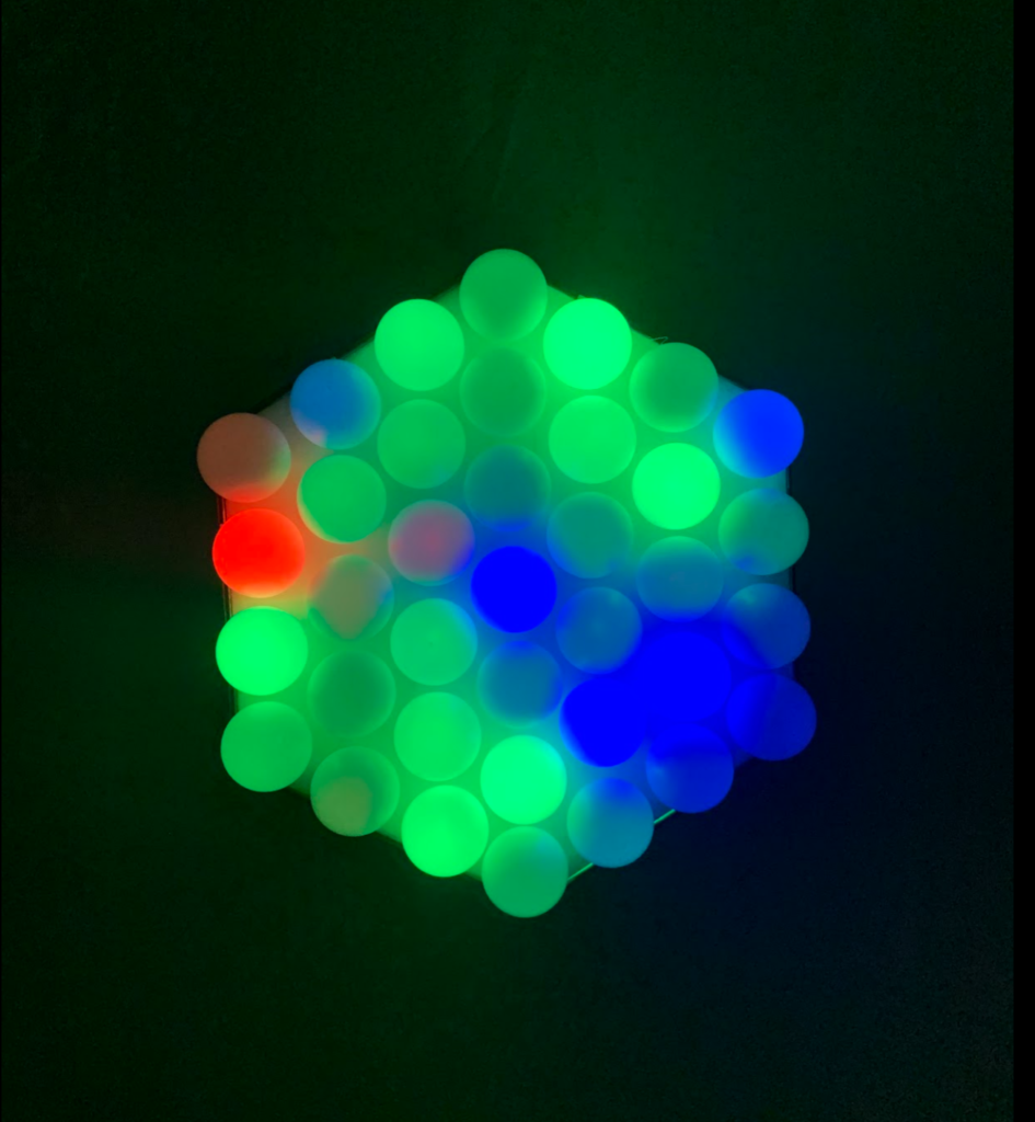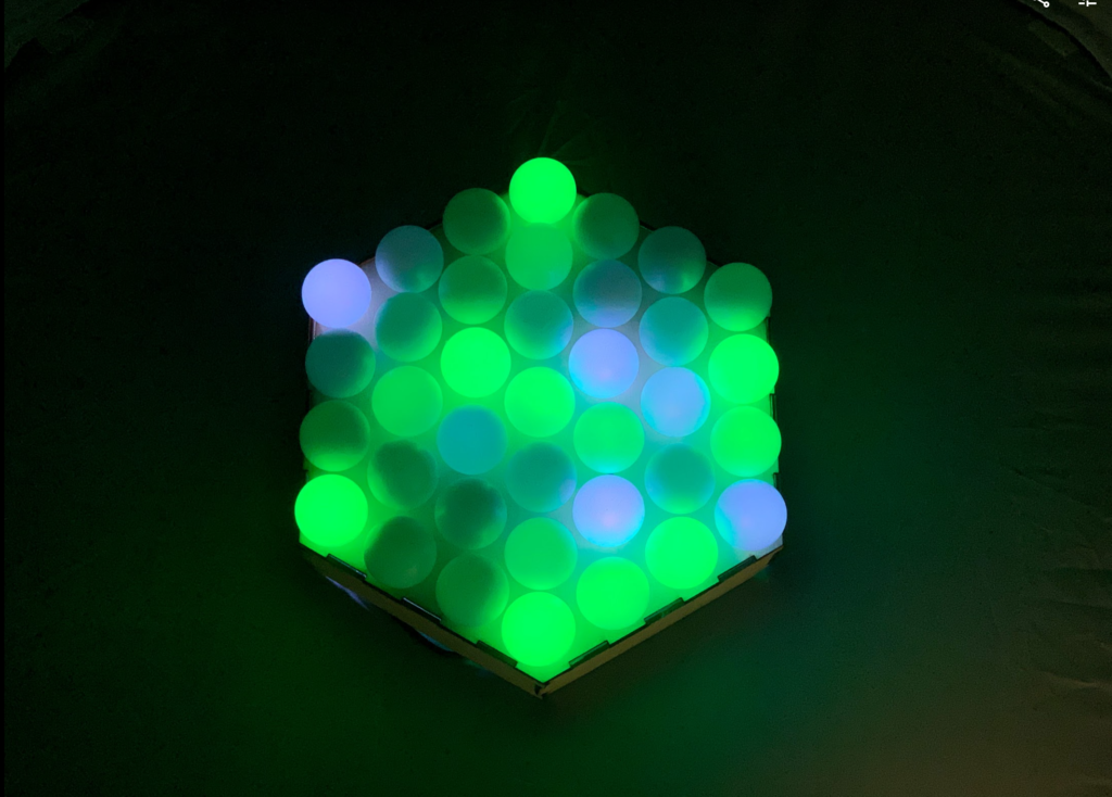 For this project, I used ping pong balls and individually addressable LED’s to create a small hexagon that would glow and flicker and fade in and out. The program I wrote cycled through five different base colors and then will randomly select an LED one at a time and randomize the color near the base color. Another program I am using runs each LED on a fixed timer and it will fade in and out with a new color.