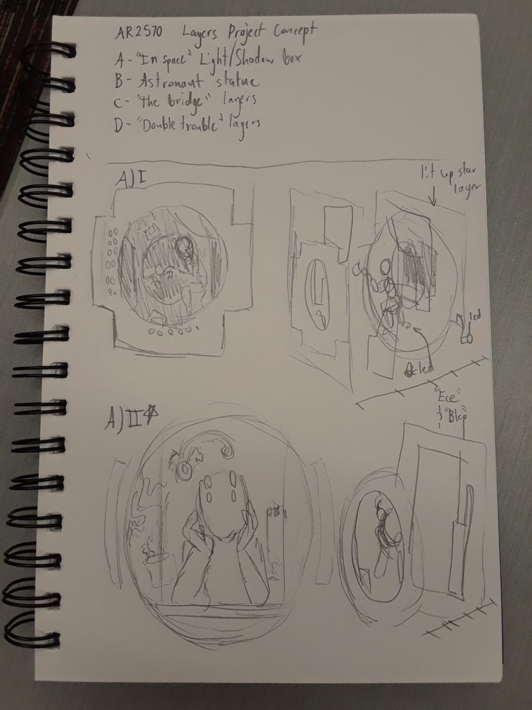 For my layers concept, I decided to go with my concept of making a statuette of the astronaut. I included all of my first round concepts at the end of this post, but I decided to go with a statuette because I wanted to have something physical that I could hold as part of my project. I also wanted to get back into 3D modeling for a bit*.