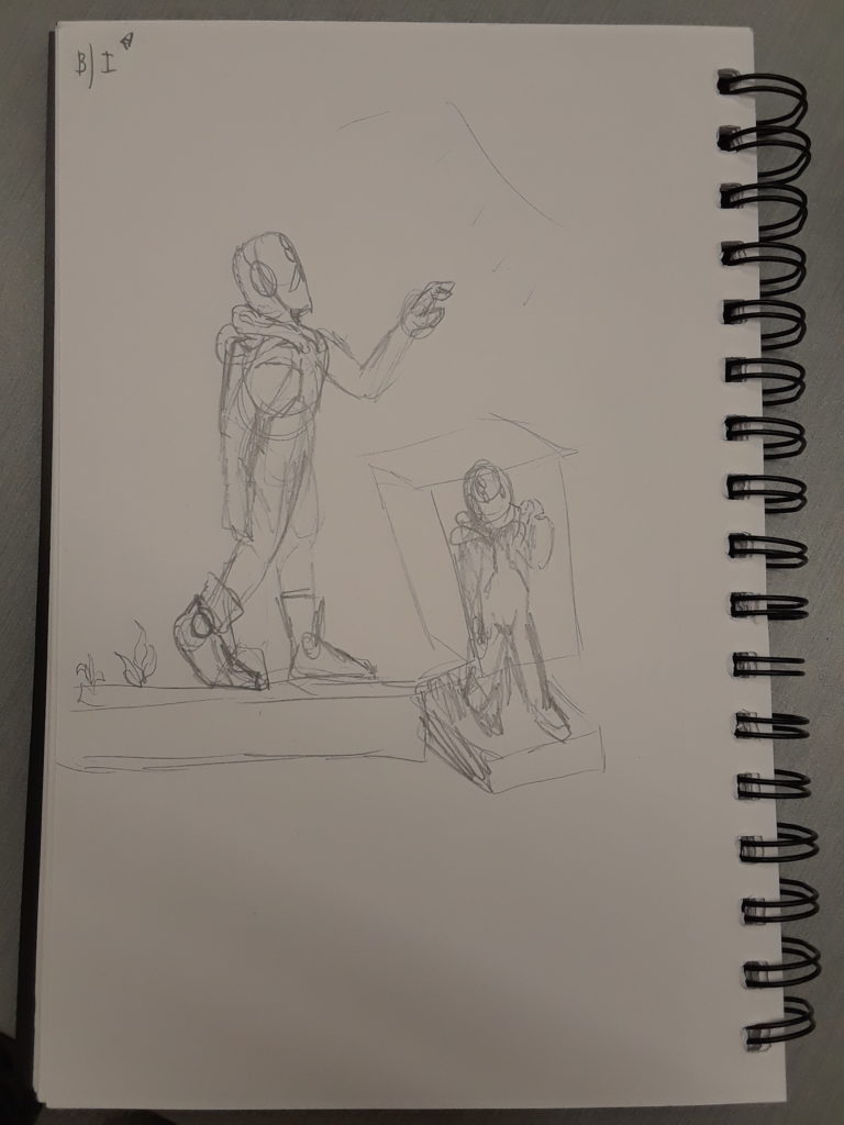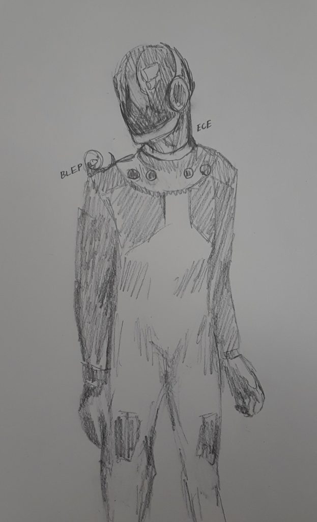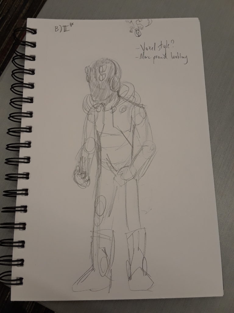 If I had a choice of how to display the astronaut, I would use a strong spotlight or flashlight faced at the astronaut. I’m possibly thinking of using a cube modifier on the model when I’m done to make the astronaut look even more unfitting to their environment (If you’ve seen the “voxel” style, this is what I’m referring to). Below is a further refined sketch of the astronaut to show positioning. I mainly wanted them to look off into the distance. I attached an early model of the astronaut as well.