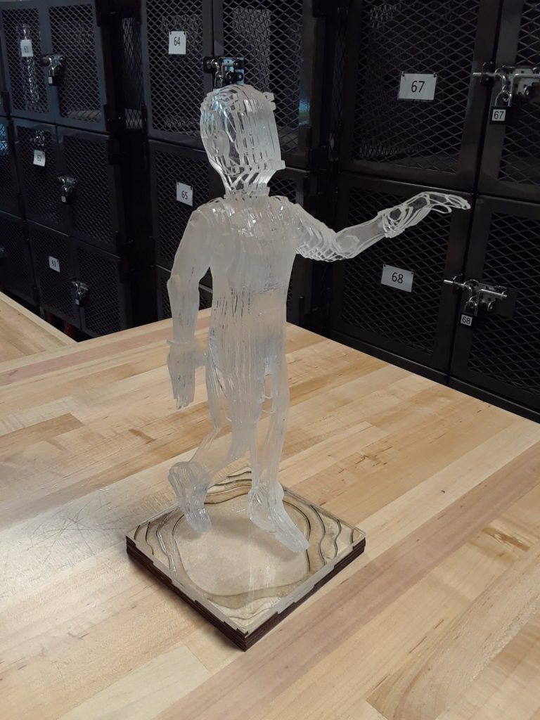 Over the weekend (April 10-11 2021) I was able to finish the final model for, and sliced version of the astronaut statue. The model had some issues during import, creating holes in the model where it should have been solid. After fixing that, the final slices were made and the final leg of the process, was started. However, an idea I had was to engrave boundary lines between shapes on each layer to denote the different pieces, such as the collar, or helmet pieces. These are still planned to be sanded, however, I’ve started to love the crystal look of the acrylic.