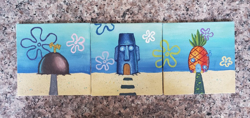 This was a series of 3″ by 3″ canvases using acrylic paint of the houses in Spongebob.