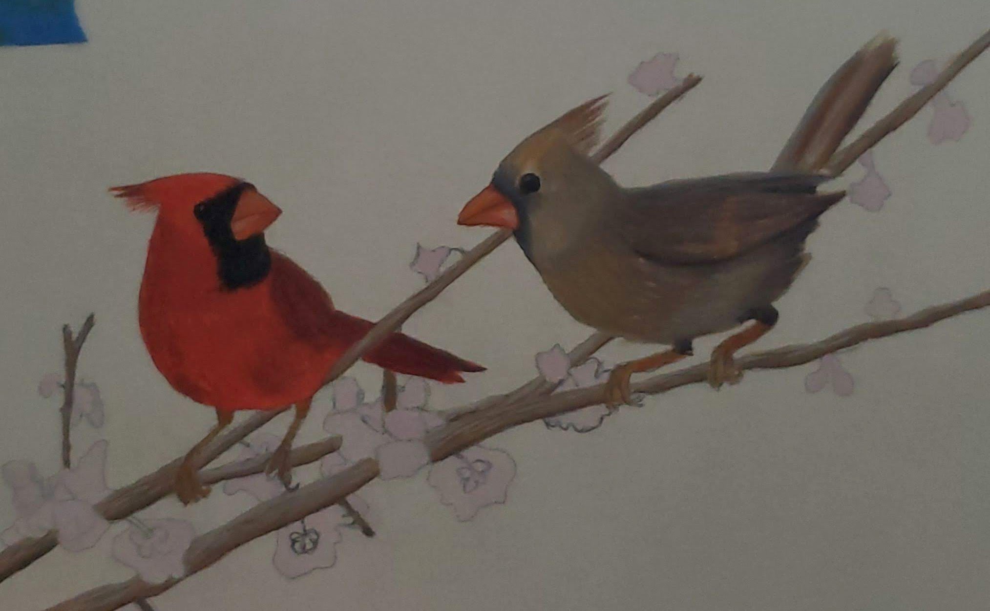 Cute: I love the little birds so much! Cardinals are one of my favorite birds to see and the way you have the pair looking at each other with cute little pink flowers is just too sweet.