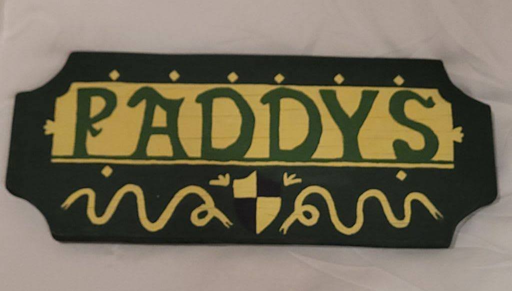 This is a wooden sign that I shaped, sanded, and painted. Inspiration was taken from a TV show bar sign.
