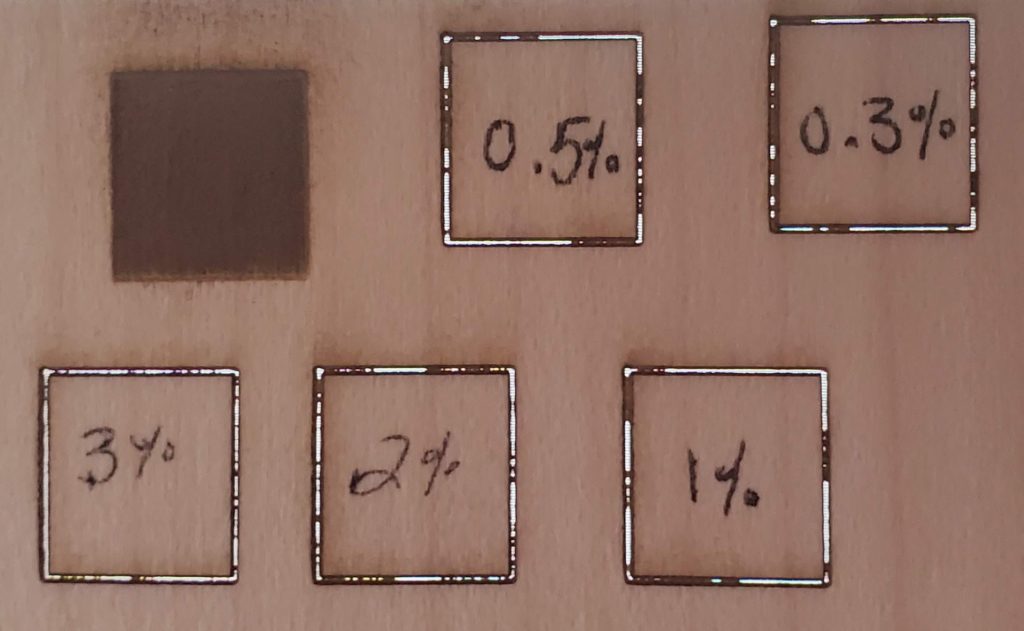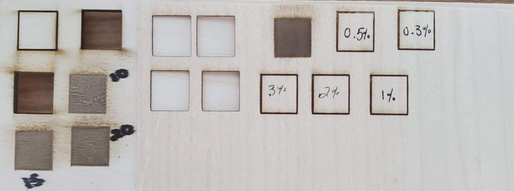 The second image I took with a white background to show how far the laser cuts through the veneer even at low power. Moving forward I’ll probably use the 0.3% power for my vector engraves and 5% power with one pass for my vector cuts. None of the vector engrave squares have fallen out of the piece however, so I am assuming that they are all pretty stable.