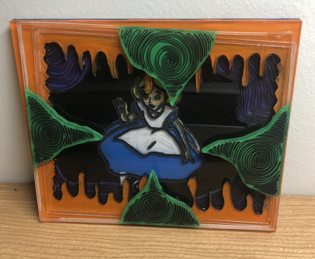 Hi Marcella! I really love the expression you captured in your layers project! The colors play along well with the fantastical theme of Alice in Wonderland and the acrylic layers accent and exaggerate the feeling of being trapped and lost.