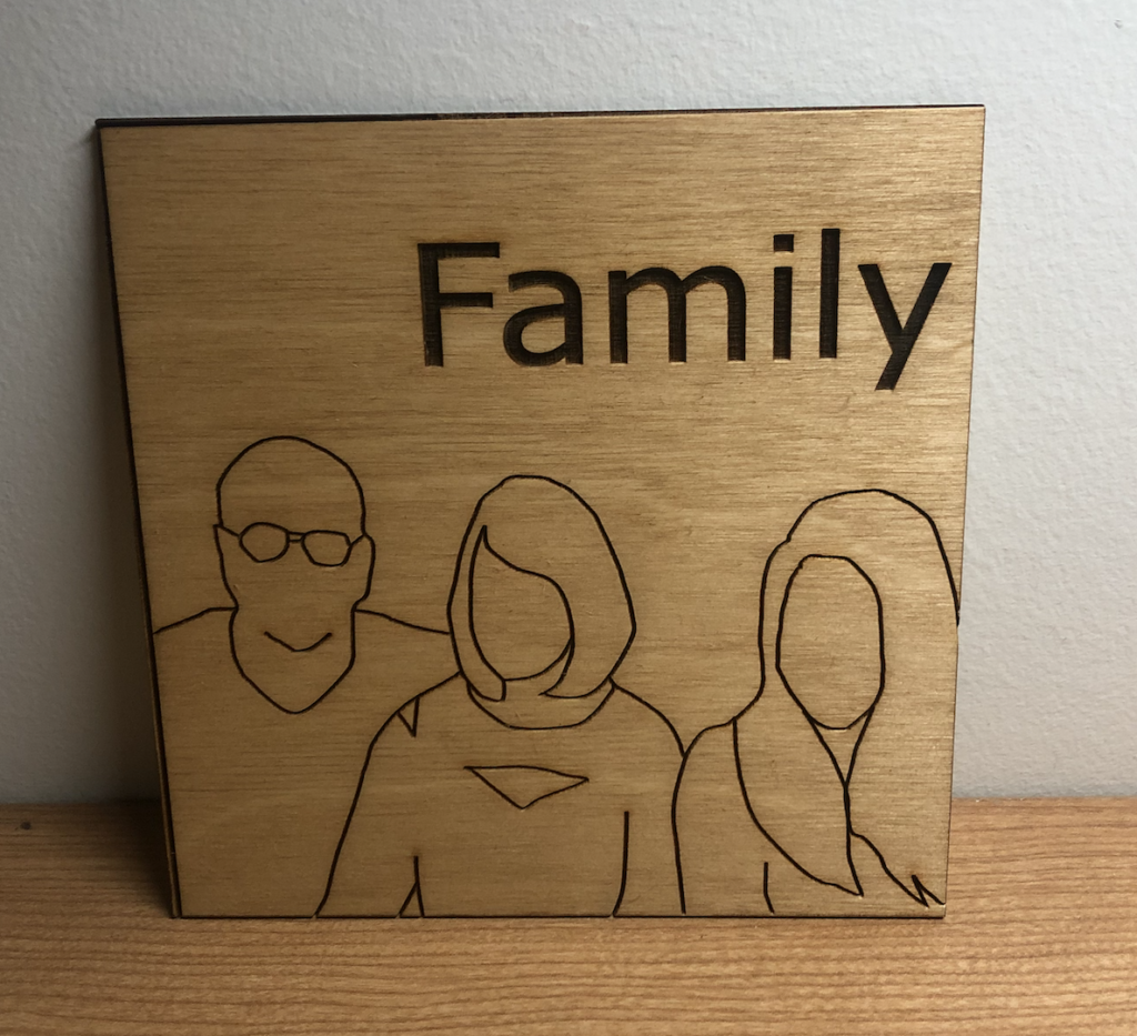 These pieces I made mainly as gifts for my parents and one for myself to keep on my desk. The Bruins coaster was a gift to my dad who loves the bruins. He is an avid coffee drinker and was in need of a new coaster. Acrylic material looked awesome and allowed the logo to really pop. Next, I made my mother this engraved print of myself, her, and my father for mothers day. I wanted to give her something I created since she has always loved my art, but also something that will be dear to her. I picked her favorite photo of our family and traced it in a minimalistic style. Lastly, I chose one of my favorite houseplants, the monstera, and ran it as my first raster engrave. It sits beautifully on my desk now!