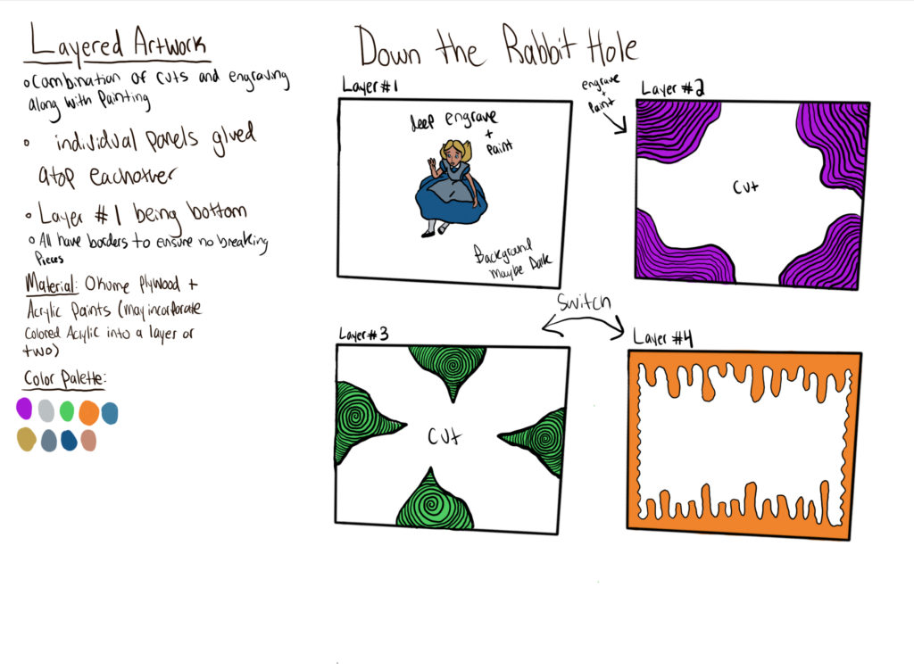 My idea for this Alice in wonderland piece was inspired by the comic art style of Mitch McGee. I was brainstorming comics/cartoons and thinking of layers brought me to the idea of falling then boom! Alice going down the rabbit hole. I am still debating on the final material I will be using. Acrylic or Okoume Plywood are my preferred options, both with pros and cons. I feel the acrylic will bring the colors out better, but plywood may bring out the engraves better. I’m hoping the different layers can convey different parts of the “hole” Alice is falling into.