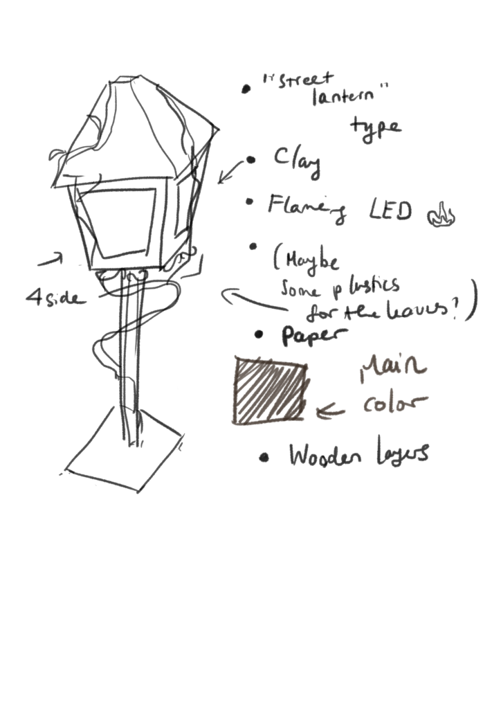 So with a little bit of help from an architect student from the maker space where I do the laser cutting, I was able to make the 3D model in Fusion 360 and convert it into 2D vectors. In order to make it more realistic, I decide to use the flaming LED bulb (I had to bike for 12km to find it, what a day), and since prof. Joshua told us to use “other” materials, I think I would use Japanese clay for the vines surrounding the lantern.