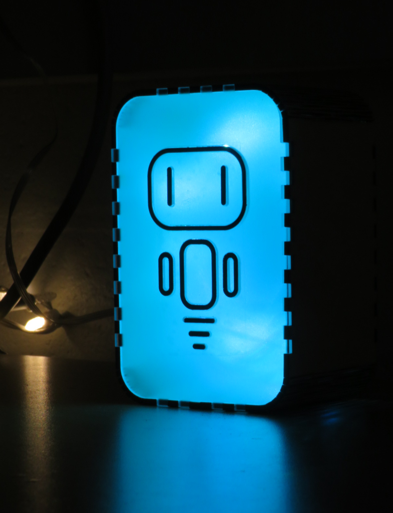 I used the rounded box design from Boxes.py: https://www.festi.info/boxes.py/RoundedBox?language=en. Then I cut out my robot design on the front face which is frosted acrylic. I colored the small cut out pieces black with sharpie and used a piece of clear tape to secure them in place. Then I placed RGB fairy lights on the inside for the light source. The piece is 9.5cm wide, 14.5 cm tall and has a depth of 8cm.