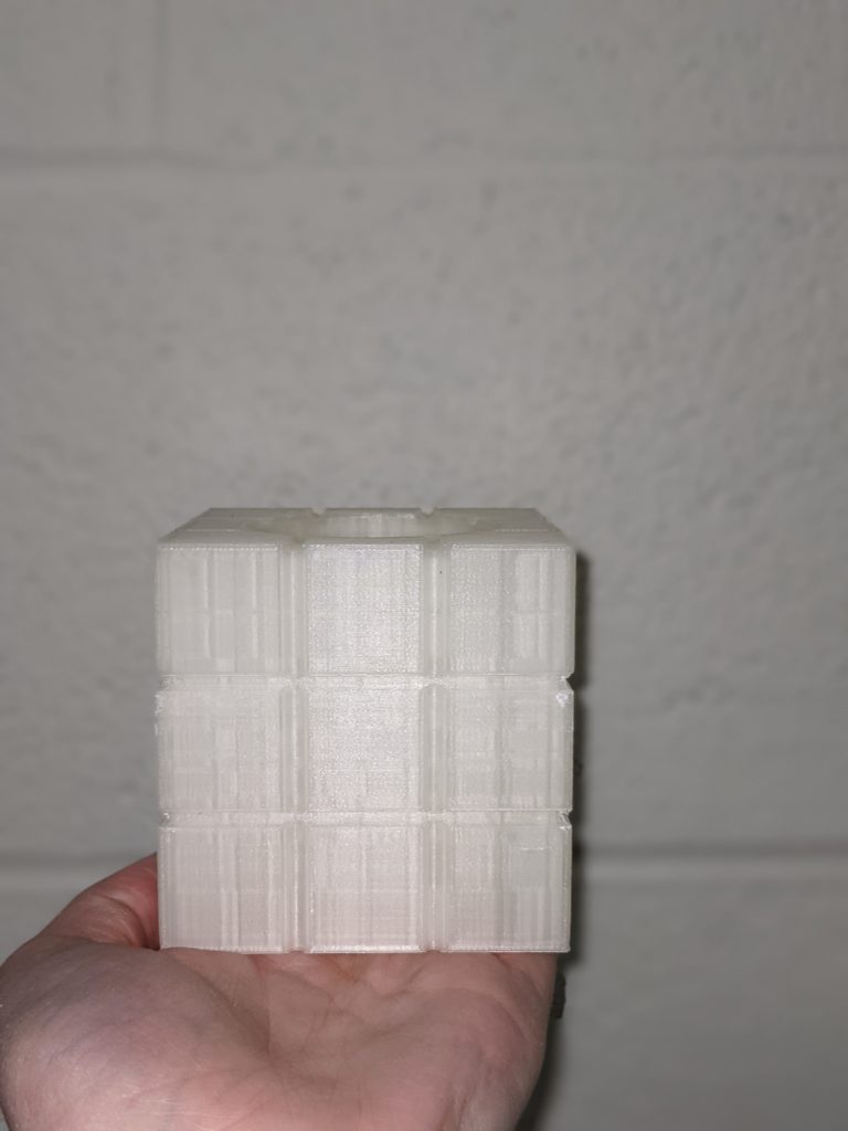 And lastly the altered toys project. I struggled for a long time on what to pick for my altered toy, and eventually landed on a rubik’s cube, and wanted to alter it by making it functional as well. I have started collecting succulents as a college student, and thought it would be nice to combine my two passions and have the rubik’s cube be a planter. I created a hole in the middle to plant a succulent, and some drainage holes at the bottom. Because of the drainage holes, I modeled a drainage tray as well for the rubik’s cube to sit in. I really wanted to leave the rubik’s cube unpainted so that you could tell that it had been 3D printed. I am really proud that I was able to learn how to 3D model and print, as it was my first time doing either.