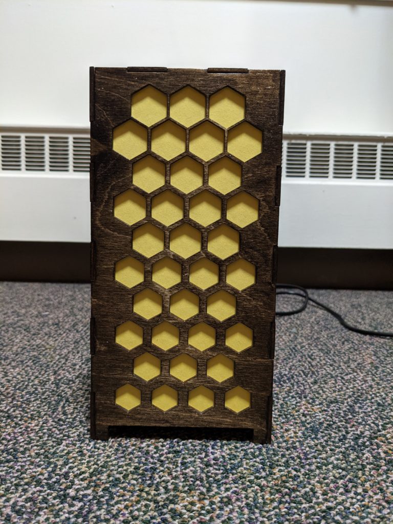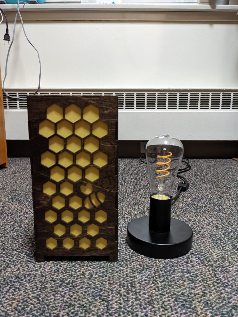 Next is the lantern project. My initial inspiration was a lantern we saw in class, that was a dissolving type of pattern, and when I was looking up some inspiration online, I found a dissolving honeycomb pattern and really liked the way it looked, so I put the same pattern on each side and created a little bumblebee cutout to put on two of the sides and the top. I decided that I wanted to do some contrasting, but complementary colors that reminded me of a bumblebee, black (or brown) and yellow! I also finished it off by doing three coats of polycrylic. I put a warm-toned lamp inside to give it a nice yellow-y glow from inside.