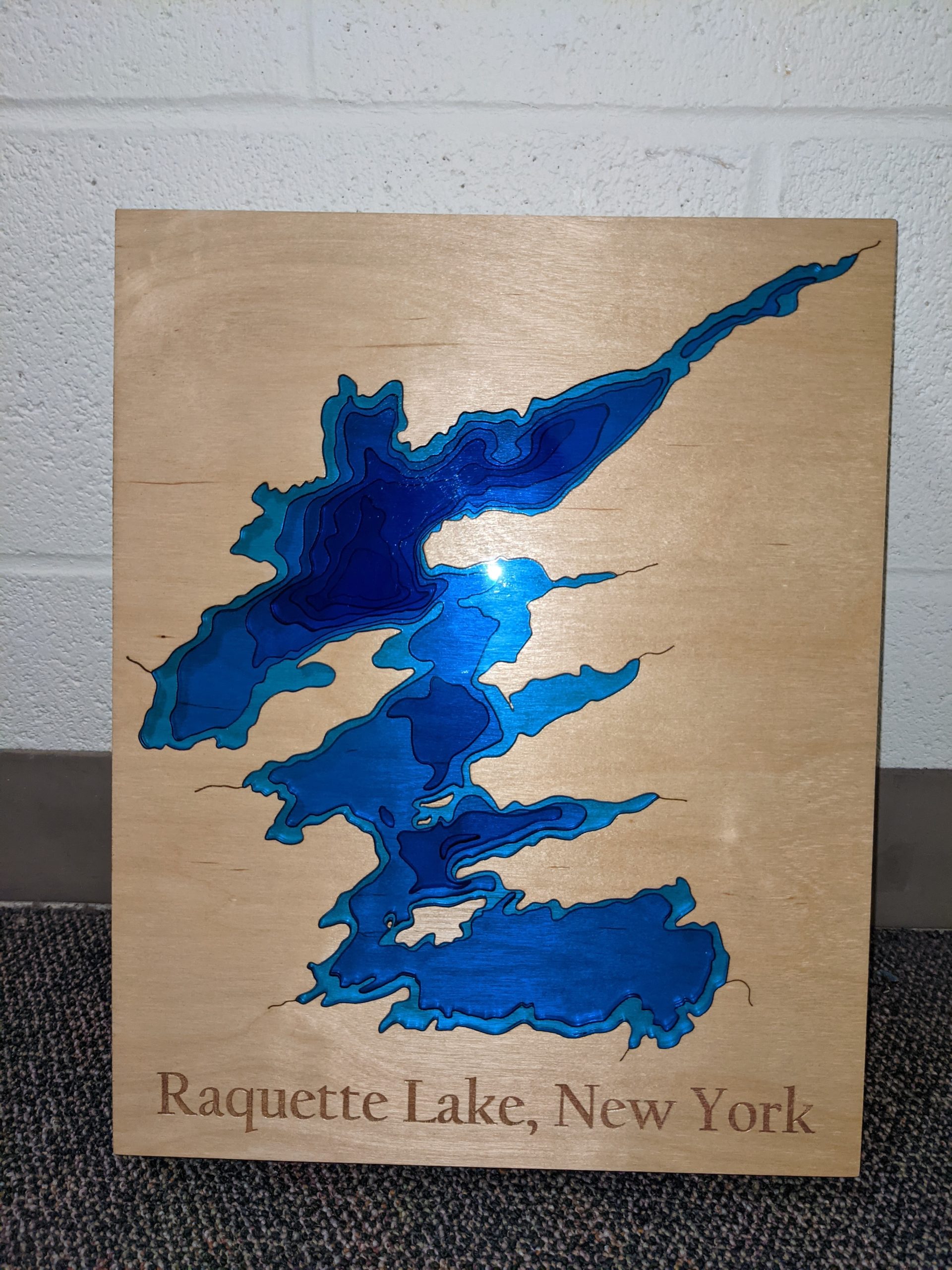 I will start off with the layers project, since that is the first project we did. I was inspired by a lake in the Adirondacks that my family vacations at every year for the past 50 years, Raquette Lake. I used a map from the DEC website and traced the different depths of the lake, with the lowest being 90 feet at the upper left corner of the lake. I used 1/4 inch pine wood and transparent blue acrylic. I cut out each layer in both the wood and the acrylic, and used a polycrylic top coat on each layer of wood, and did three coats on each. I then placed each acrylic piece into the matching layer of wood and glued the back so the acrylic pieces didn’t fall out. I ran into an issue with the wood being slightly thinner than the acrylic, so I had to compensate by adding three layers of wooden veneers in between each normal layer of wood, and I glued them together using wood glue. I am so proud of how it turned out, and the acrylic effect of the depth worked exactly how I wanted it to.