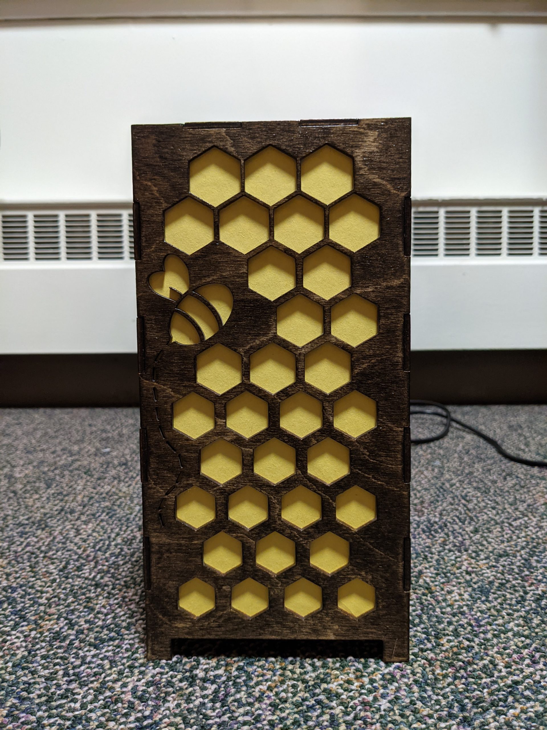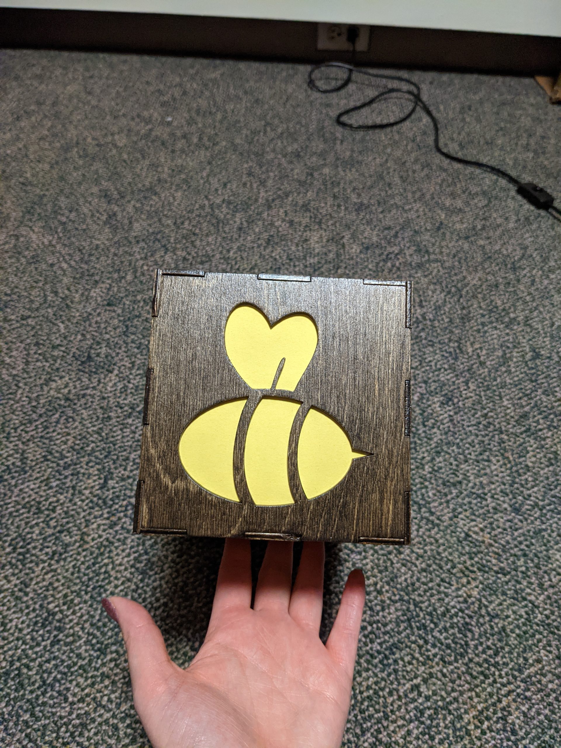 Next is the lantern project. My initial inspiration was a lantern we saw in class, that was a dissolving type of pattern, and when I was looking up some inspiration online, I found a dissolving honeycomb pattern and really liked the way it looked, so I put the same pattern on each side and created a little bumblebee cutout to put on two of the sides and the top. I decided that I wanted to do some contrasting, but complementary colors that reminded me of a bumblebee, black (or brown) and yellow! I also finished it off by doing three coats of polycrylic. I put a warm-toned lamp inside to give it a nice yellow-y glow from inside.