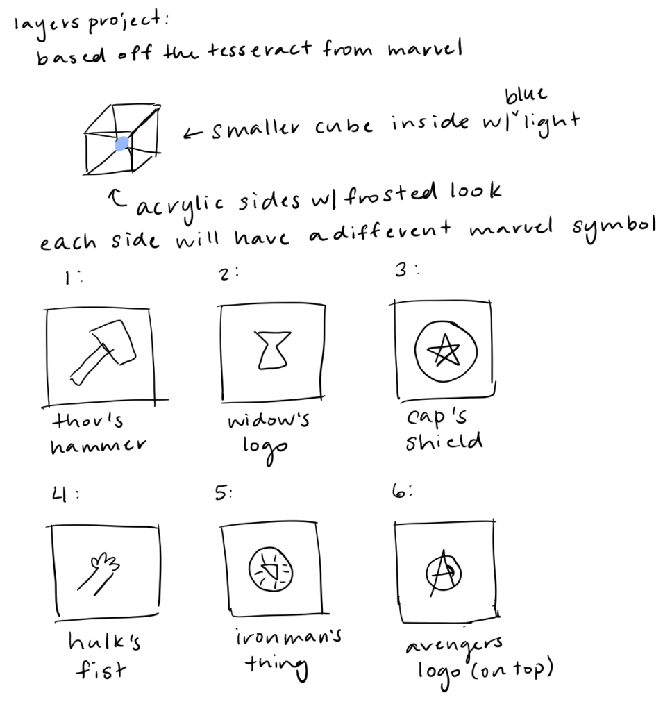 For my lantern design, I’m taking inspiration from the tesseract from the Marvel movies. The lantern will be a cube, with a tinier cube inside that has a blue light. I’m not sure how this will work yet, but hopefully I’ll figure it out. I want to make it the size of the tesseract from the movie, so I’m going to follow the dimensions of that tesseract. I’m planning on using frosted acrylic for the sides to make it look similar to the tesseract. For the lantern effect, I want to engrave different symbols from the Marvel universe on the sides.