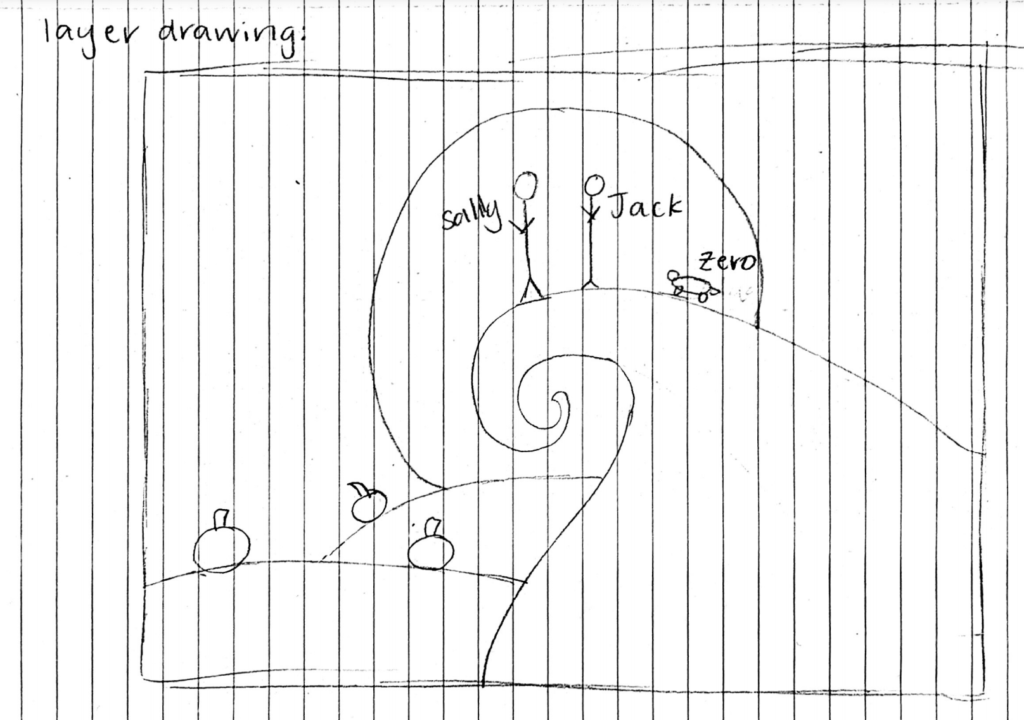 For my layers concept, I want to do something themed around Nightmare Before Christmas. Halloween is my favorite holiday and I really love this movie so I thought it would be really cool. I didn’t really know what I was going to do until I went through a few posts people made and I saw a layers piece with a skeleton, and I was immediately inspired. I’m not the best at drawing so I drew a very rough sketch. I want to make the scene where they stand in front of the moon on top of the hill holding hands. When I make a more definite sketch I’ll definitely update the post.