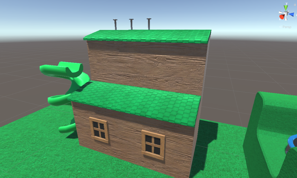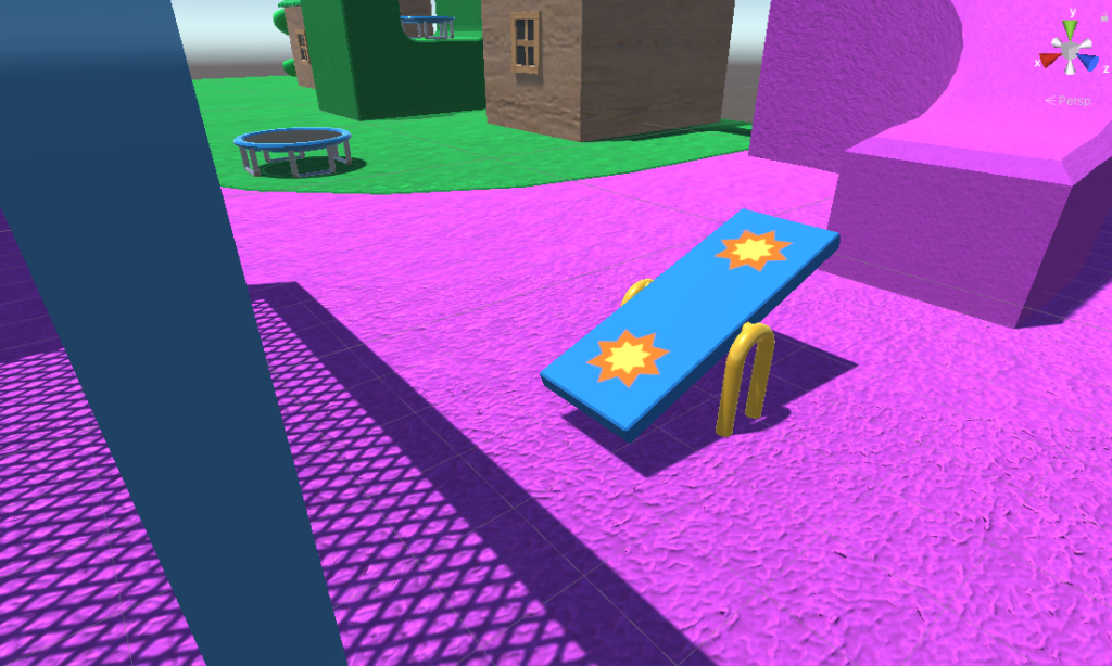 The playground setting. The pink side has grated platforms, slides, and seesaws which can be jumped on and tipped from side to side. The green side has wooden buildings with tiled roofs and fences. The idea was always for the game to be a playground, both literally and in the sense that it’s a playful, relaxed environment. So while the equipment might not function in the way I had initially hoped, the spirit of jumping and diving around a colorful playground came through.