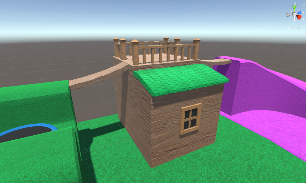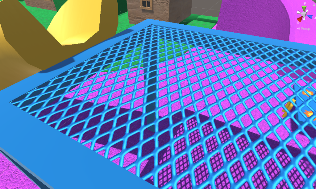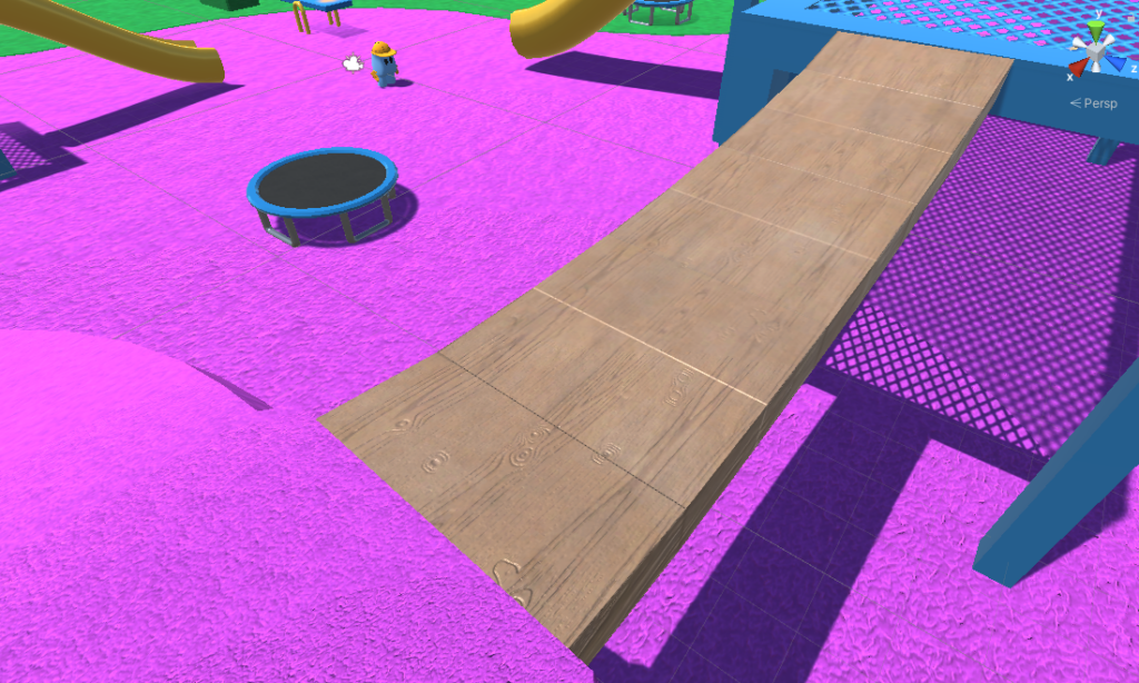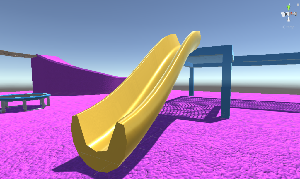 Another technique I figured out was to use replacement meshes. Many objects can use simple box colliders, and I have some objects like the trampolines or the green terrain which are made of multiple box colliders. Sloped surfaces like the slides or the pink terrain needed something more intricate than boxes, but the complex mesh colliders gave the character controllers some difficulty walking. The idea I later had was to send lower poly models to Unity, make them invisible, and just use them for their mesh colliders. This would give the character an easier surface to walk on without limiting the quality of the visuals. It might even have the added benefit of helping the game perform better when there is an abundance of complex geometry. This was not necessary for me, since my game isn’t technically demanding and the final character controller didn’t struggle with complicated terrain, but I’m sure this would be a good practice for future projects.