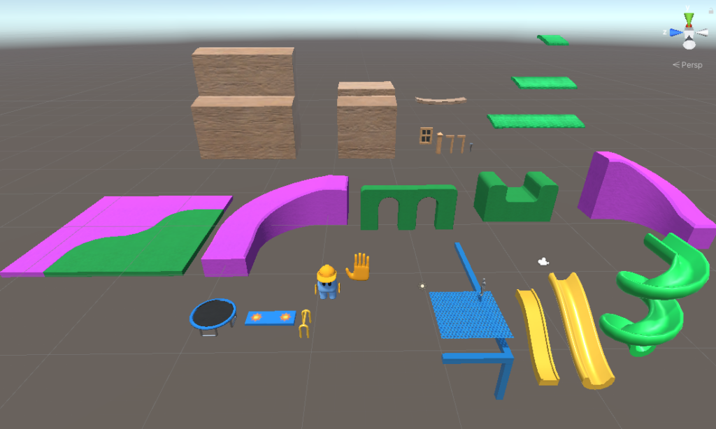 You take control of a blue bean-shaped character with giant hands called Manny. The premise is that he’s a construction worker, sent here to pound some nails which might pose a safety hazard for children. The nails are only found at the top of the taller wooden structure, but there are multiple intended paths which can get you there from all over the map. Since the map only contains models and not functioning playground equipment, the nails are currently unreachable.