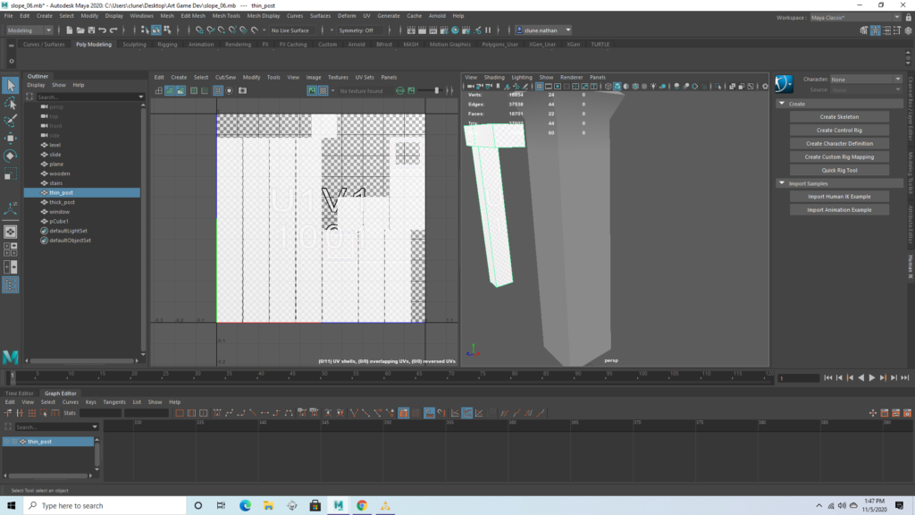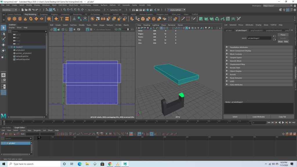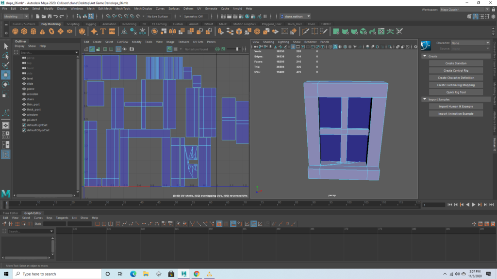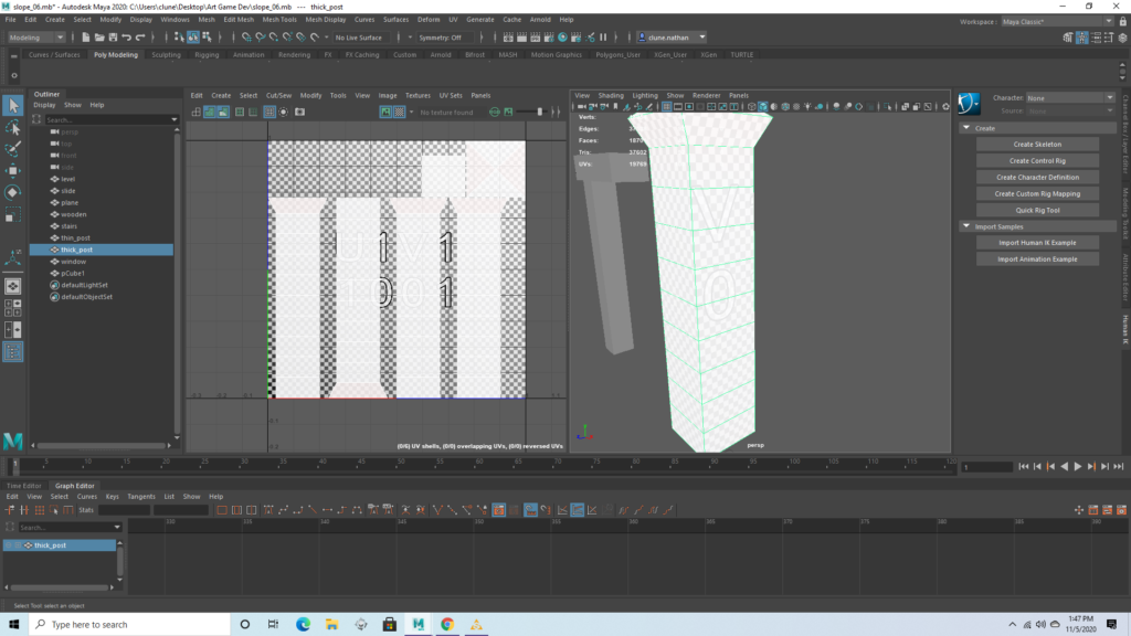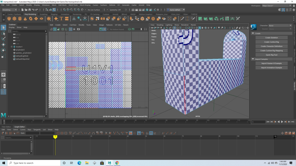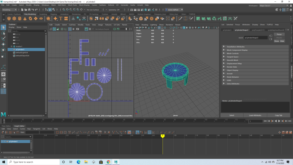 Wooden post (connector)Wooden post (large)The seesaw base has some distortion on the side which will prevent the texture from tiling perfectly. This drives me insane, but the texture isn’t detailed anyway and I was instructed to not worry about it.The seesaw itself is just a prism, and had no distortion whatsoever. This is important because it will have a somewhat more detailed texture.There are several duplicates found in the UV map, and I intend to stack the duplicates so that they have identical textures. This will let all these objects easily fit in one box and may even reduce texture work later on. I made sure that these duplicates are on opposite sides of the trampoline, so it will be impossible to see both copies of a texture at once.I reduced the poly count of this model, which gave me some strange geometry, but the UV map should be functional. The rectangles which are outside the first box will not be visible.