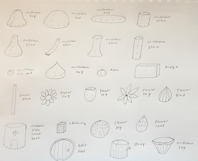 My modular kit mostly focuses on the nature in my level, since that is mostly want my level is about. I have a lot of different tops of mushrooms that I can then stick on one of the mushroom stems I have. This will allow me to have a lot of variation in my toadstools. I also have some different flower tops I can put on the flower stem. I have the flower leaf separate from the stem so I can put as many or as few leaves on each flower as I see fit. I will need a basic rectangular hedge that I can then duplicate and form the maze and edges of the level with. I will be able to decorate the hedge with different nature elements, such as having mushrooms and flowers growing out of it. I also have a rock and stump I will make to add some more variety of the types of nature you see in my level. I also will have a base for the house of the pixie town. These house bases will use different tops of mushrooms as their roofs. I have a chimney I can put on the tops of the houses, since it is separate I can move it around to fit the mushroom top houses better. The final element for my level is the exit door. This is the door you find at the end of the level, which is the end condition for the level. I based the door off Hobbit doors. I am planning to texture these elements using my skills in digital painting, since I am much better at 2d art than 3d art.
