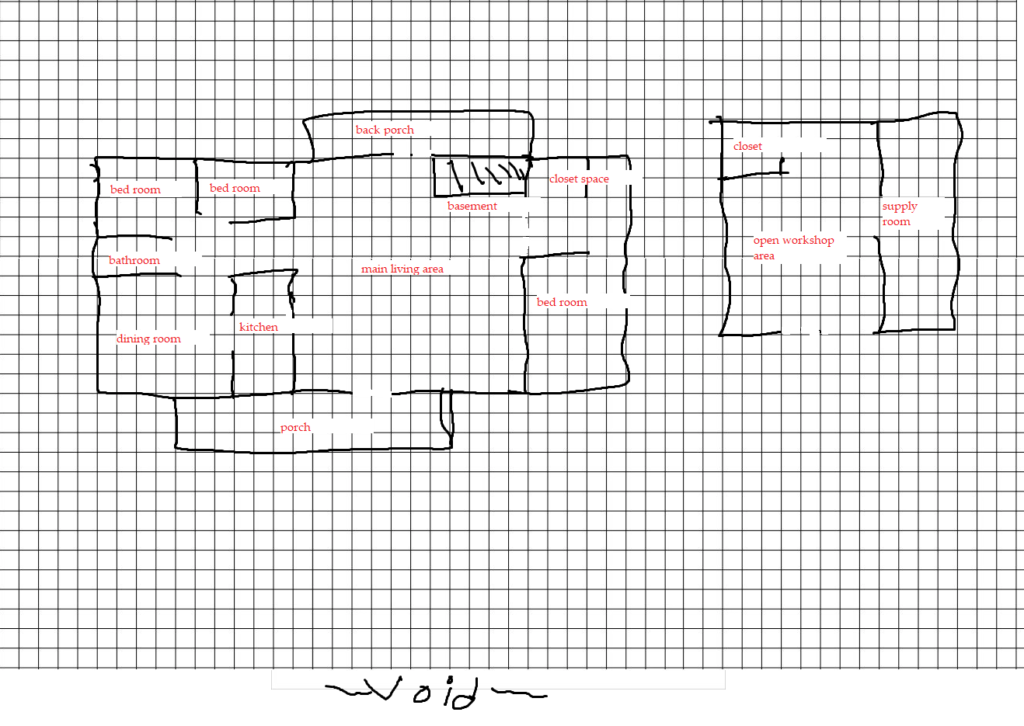 This is the spatial layout of the buildings of the level. The main house is the bigger building on the left, consisting of many rooms for the player to walk through, and a basement which will run underneath the house. To the right is the workshop where a lot of tools can be found. The rest of the space is the property from which the Ranch resides on. Both buildings will have a very free and non-constricting flow, as both entrances to the buildings will be the biggest rooms in the building with other open optional paths open for the player to explore.