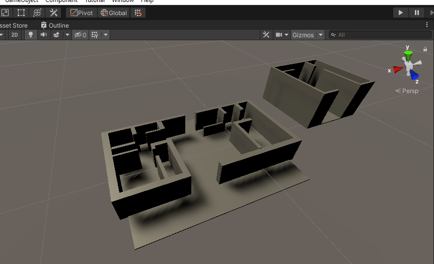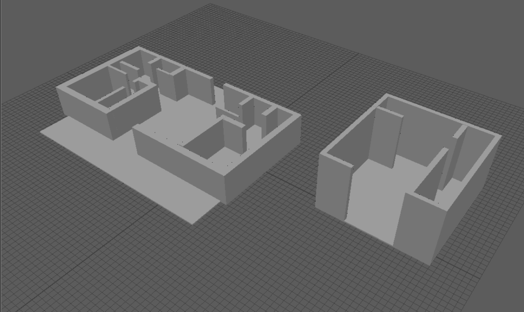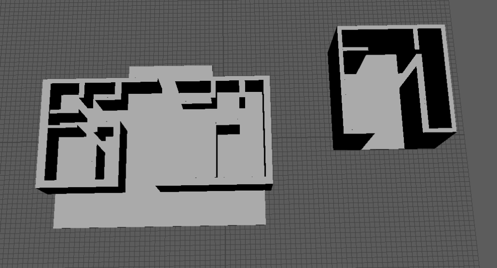 The three images above are a rough 3D greybox of the level. The first two are in Maya and the third is in Unity.
