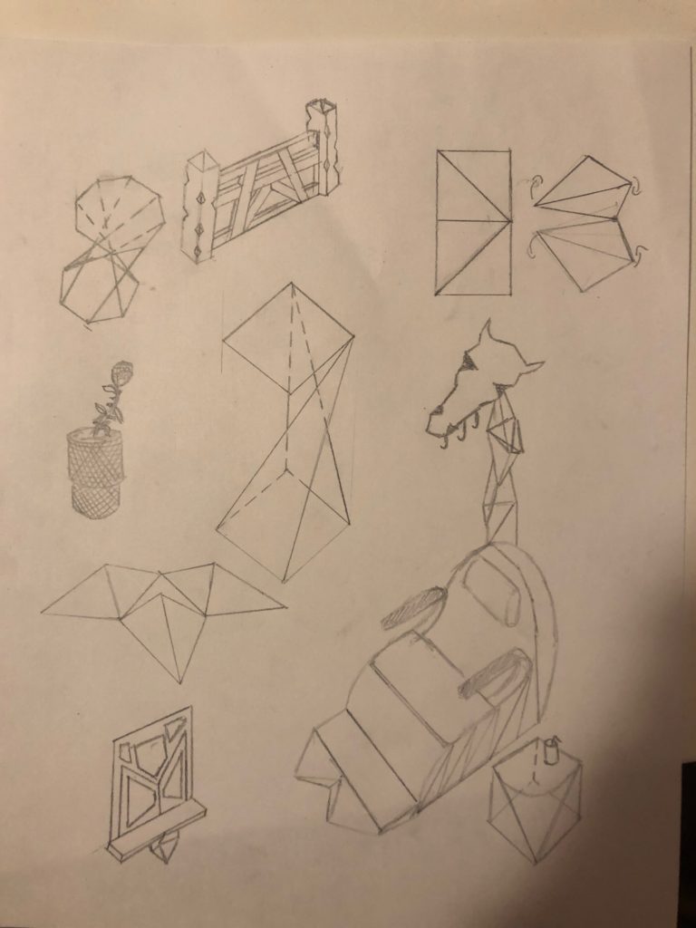 Here are a couple of sketches for furniture within the house on the Ranch. There is an emphasis on geometric furniture, which I searched on the internet for inspiration. This will be very modular because of the abstract shapes, allowing for different rotations of these meshes to become other objects of furniture upon decoration.Here is the concept for things like the wall, ceiling, and any flat surfaces the level may require.