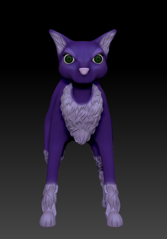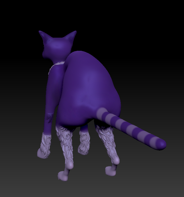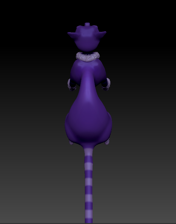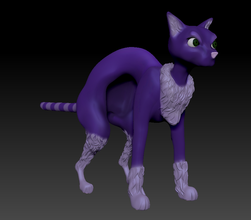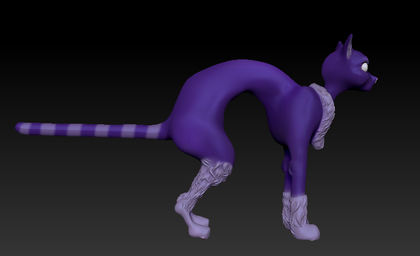 Here is my character model, that I sculpted and textured in zbrush. I had a fun time making the cat have that big hunch. I think I definitely achieved my goal of making a cat that looks devious, but still visually challenging.