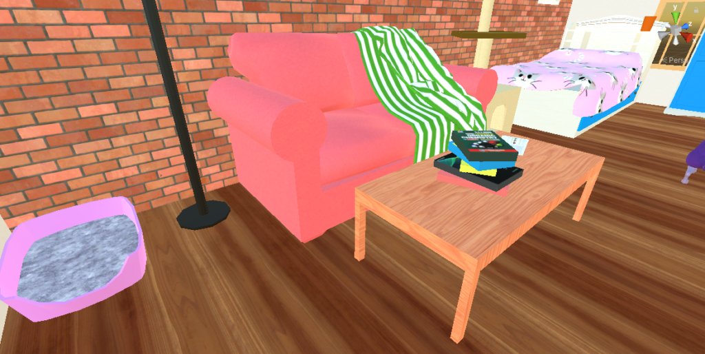 I sought out to make a game about a cat who wreaks havoc. I think I have definitely met the art goals that I set for myself. The room feels colorful and populated, and it has many things that the cat could knock over and mess with.