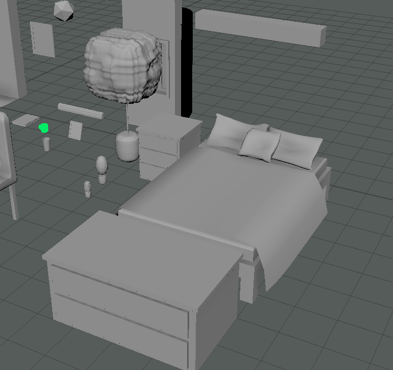 I’m really happy with the major leap my environment has made this weekend going from just the core assets to a close to finished product. While I know this is meant to be a completely finished environment, there are still things I would like to go back and change as well as add, such as the blanket not laying properly on the bed in my actual environment but appearing to lay properly in Maya as well as a doorframe that accidentally got smoothed, so it doesn’t line up flush with the other walls. Other than that I’m getting closer and closer to having something I can be proud of 🙂