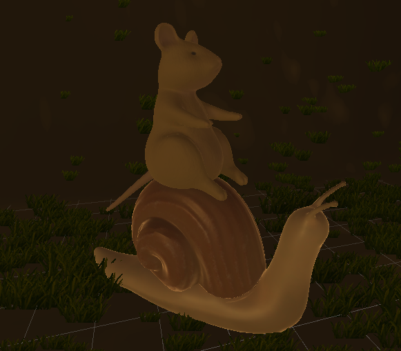 Snail Tale allows players to become a snail-riding mouse exploring a foggy mushroom forest. The slow movement speed and soothing ambient music create a relaxing environment. An important part of the scene is composition. The foliage consists of only a few mushrooms, stems, and leaves, but they are varied and placed in a way that adds depth.