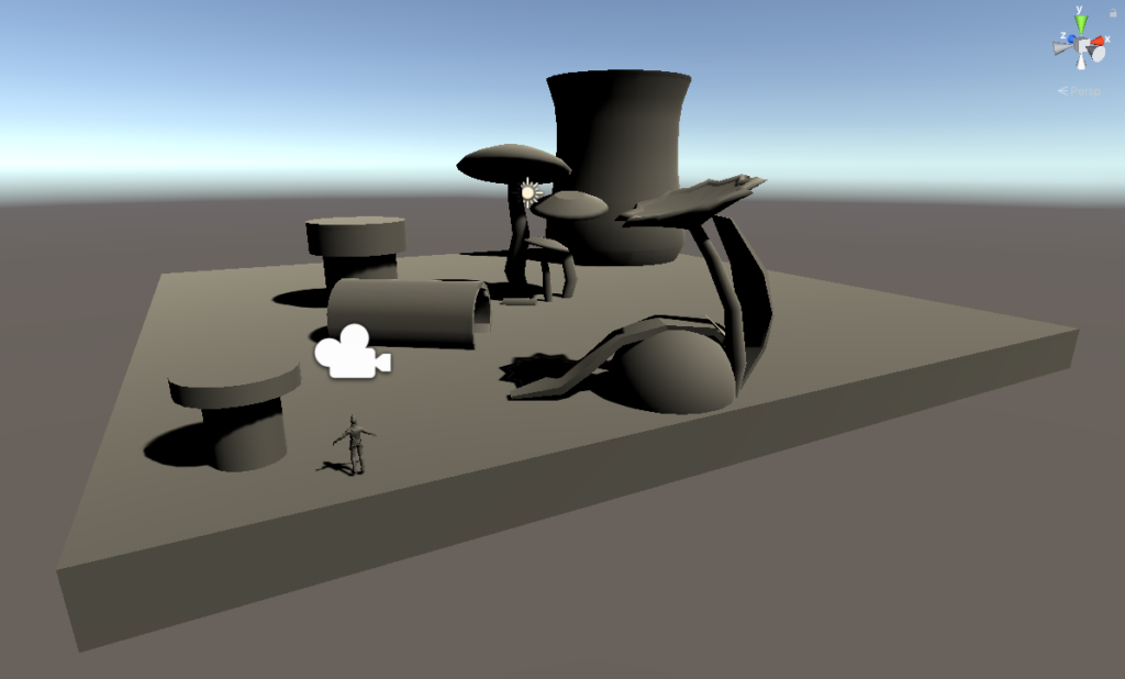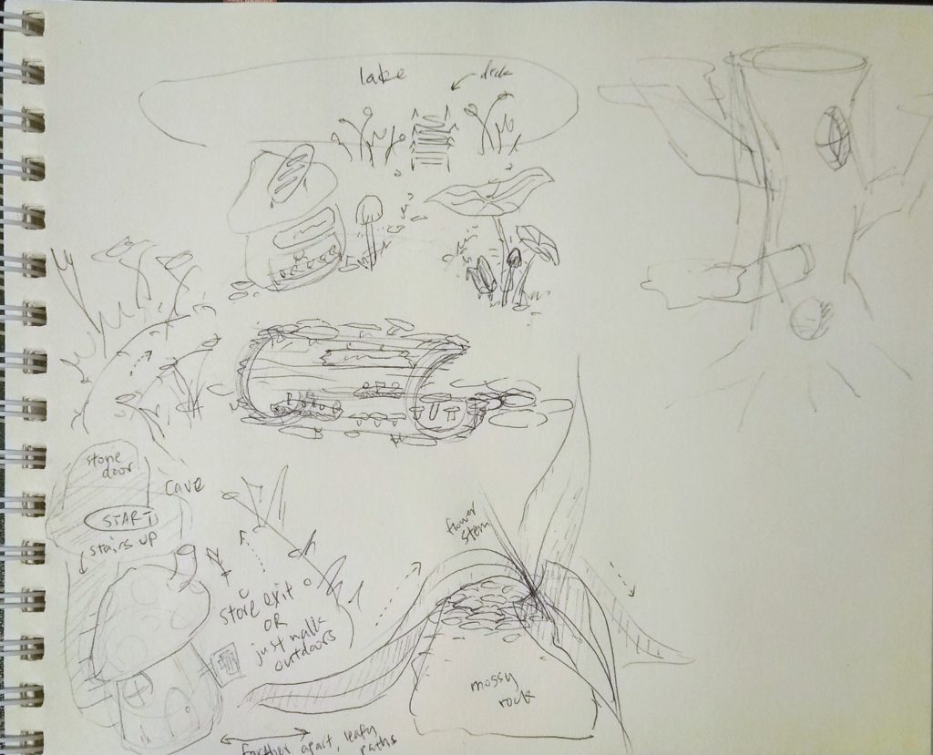 The player starts out either in a cave or inside a store (bottom left) – somewhere indoors. I’d like to give the cave a try since I’ve never made one before. The ending treehouse (upper right) should have some indoor space.