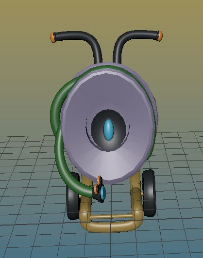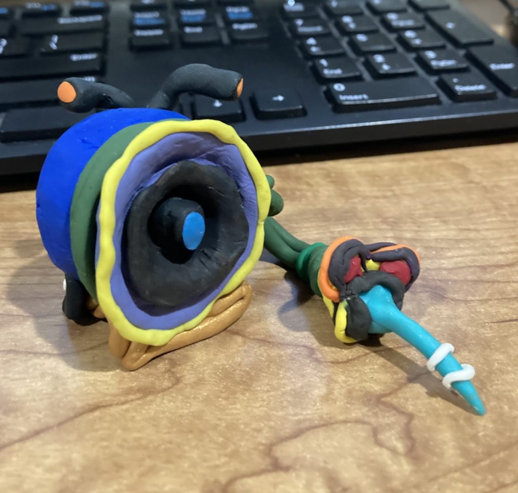 I also used this small clay sculpture as inspiration. Sandy is generally quiet and grumpy with a bit of sass. Their hose is another sentient being attached and it squirts water on flowers. When I modeled in Maya, a bit of sass was lost.