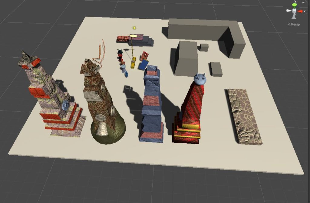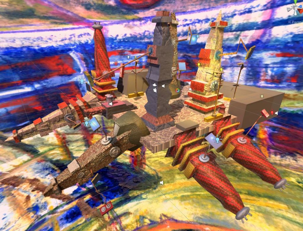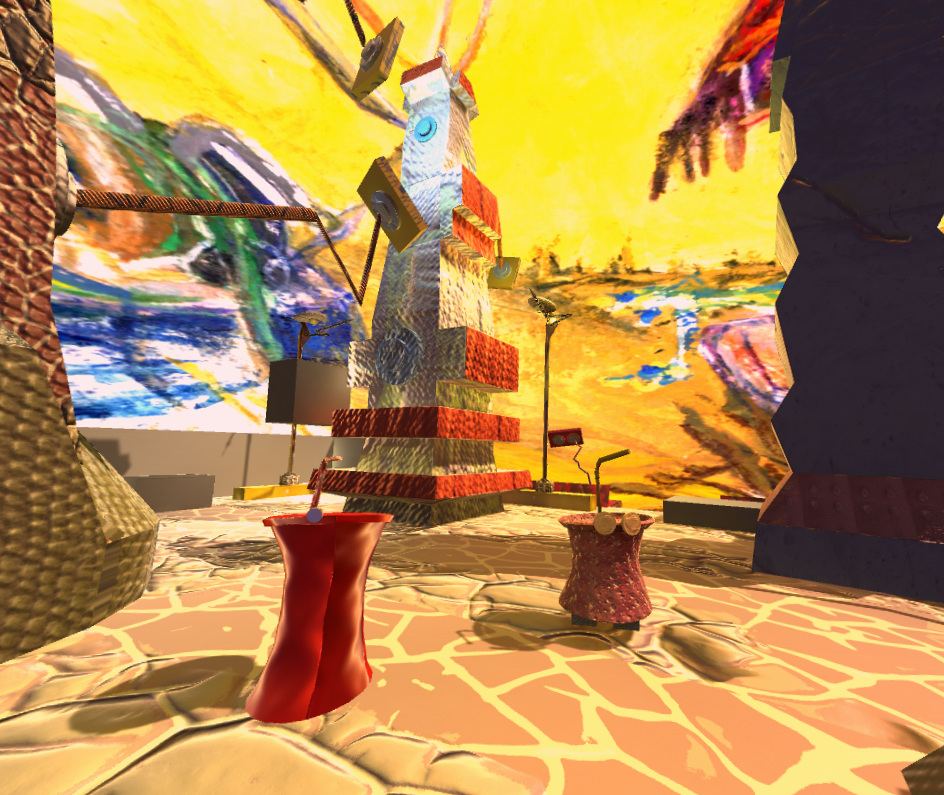 My game level is loosely inspired from a world inspired from symptoms of bipolar spectrum disorders. I have been developing this world (titled Polarenti) for MQP, but the specific area of this level’s inspiration is called Magora. In the end, my game level concept is mainly a surreal environment filled with sentient objects including buildings, soda cans, streetlamps, and a garden hose. I took inspiration from abstract artwork and surrealism. The objects make strange noises and I added some lens distortion to give my level an unusual and somewhat wonky vibe. I attempted to create a disorienting environment with building tentacles jutting out at different angles and an intense saturated color palette complete with basic particle effects and a skybox with a painting of Magora.