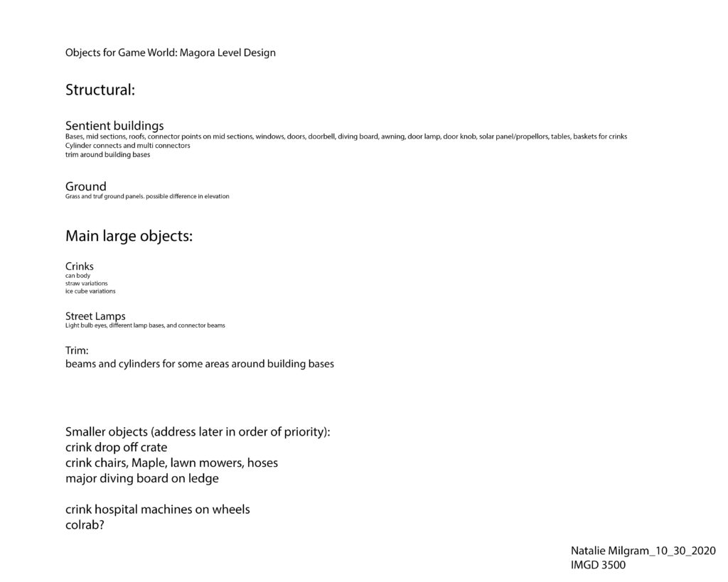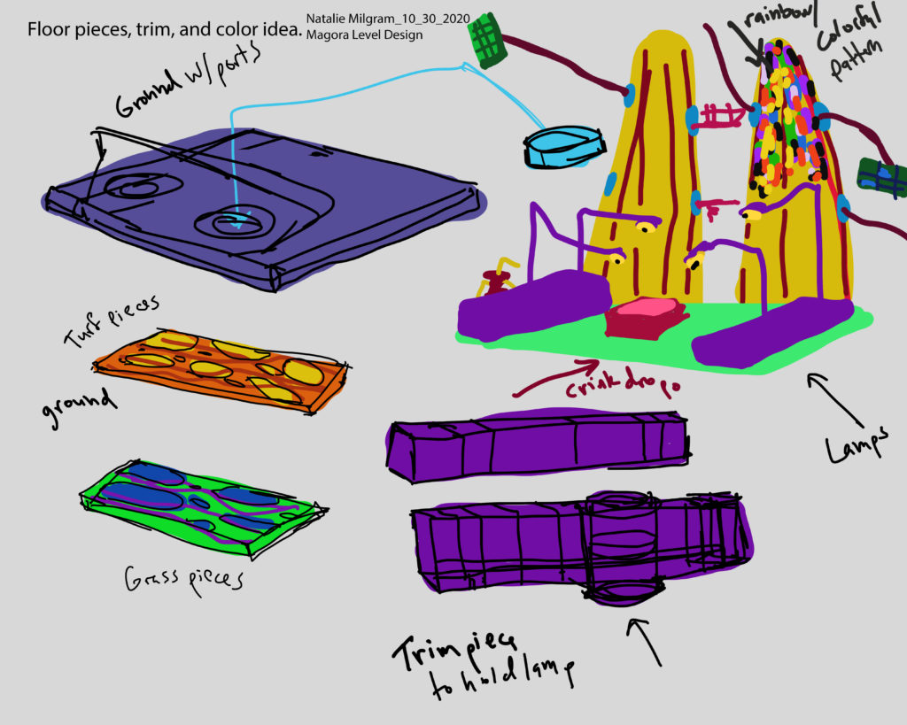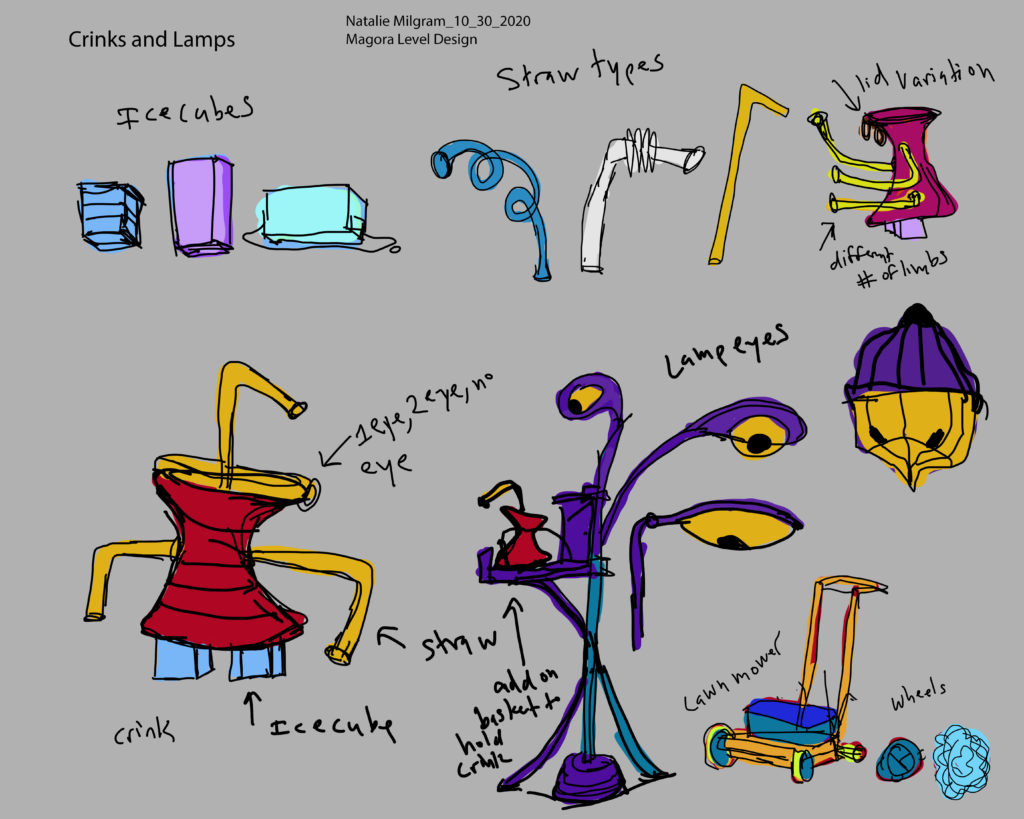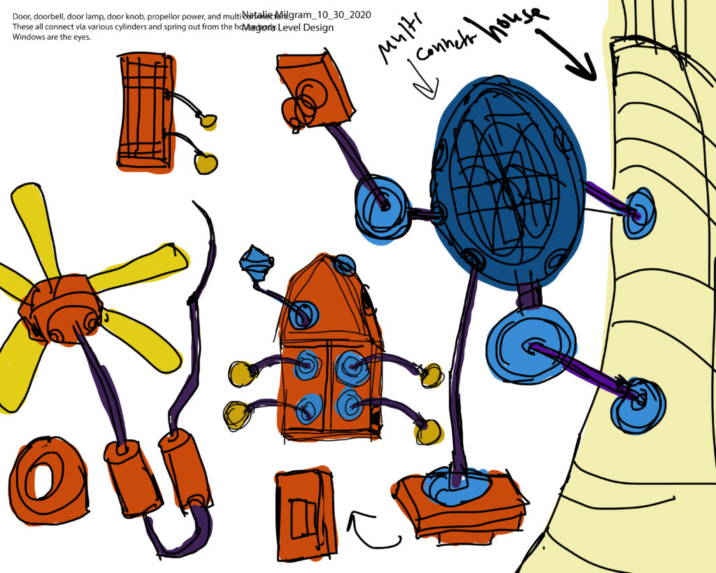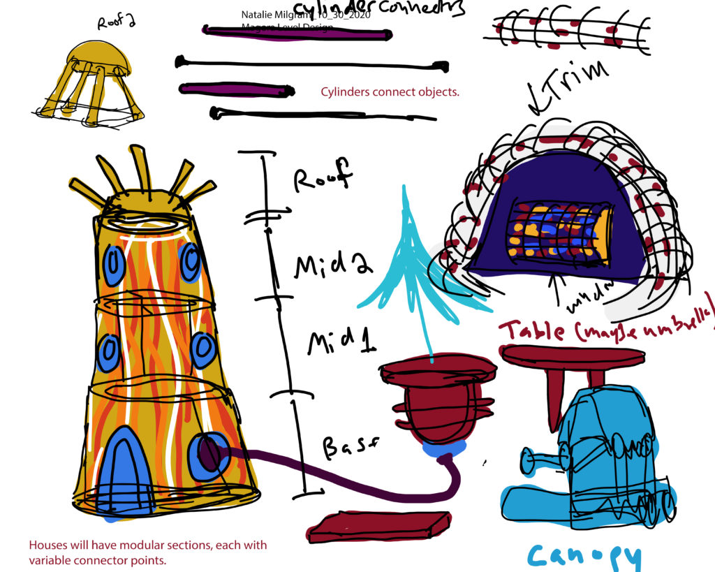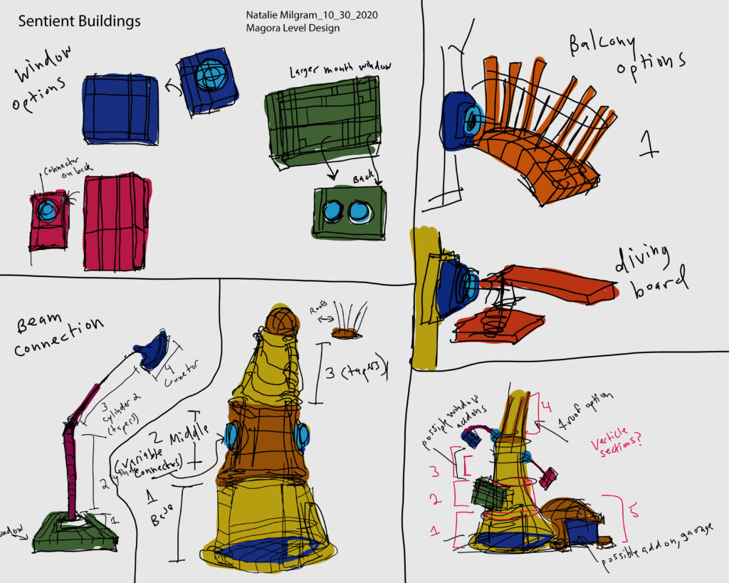 After completing this assignment, I am realizing that I will not have time to complete the initial level I envisioned. I now feel that the bridge, Colrab, and Mixamucks are stretch goals. I will be focussing on the residential area, street lamps, and Crinks to start out. My main concept for this modular kit is regarding my sentient buildings. I plan to have multiple sections of building with connecting points. Cylinders would then branch out from there ending in various objects such as windows, diving boards, balconies, door bells, and door knobs. I have created some sketches and color ideas for this kit.