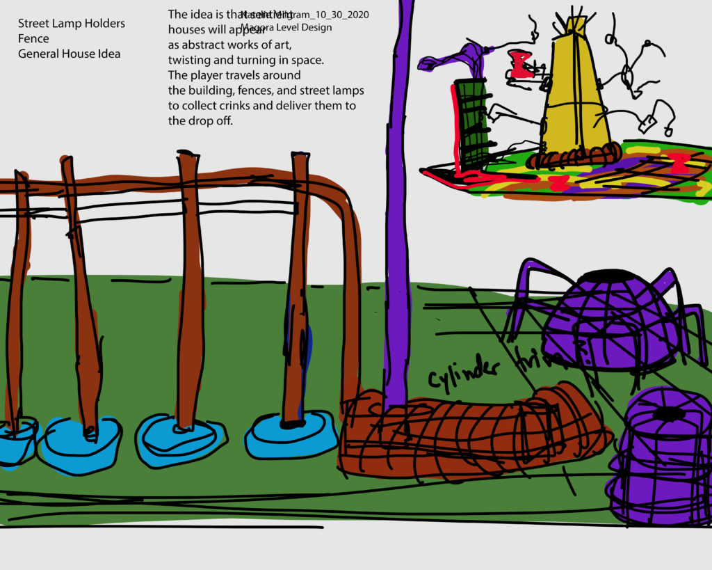 Above are potential examples of building connectors and specifically windows which would be the eyes. Here I was exploring roofs and also side tables. Various cylinders would branch out from the buildings. This sketch shows my idea for a multi connector- resulting in many objects branching out. I collected additional reference on house objects.I also am possibly making trim pieces in the form of cylinders to cover up some seams. However, with the nature of my cylinders and window connections, I don’t think much trim is needed.I realized that my level’s look is is very much inspired from K’nex and also abstract art. I would use bright colors, and also maybe try to make some colors swirls with painted textures. Some ideas for floor patterns and street lamp holders.I researched some patterns of stained glass and abstract art for inspiration.I like the look of these buildings, they are wonky and warped.Some ideas for main object inhabitants (soda can Crink, lawn mower Crink, and street lamp eyes). These objects would be scattered in the residentail area.Additional research on street lamps.