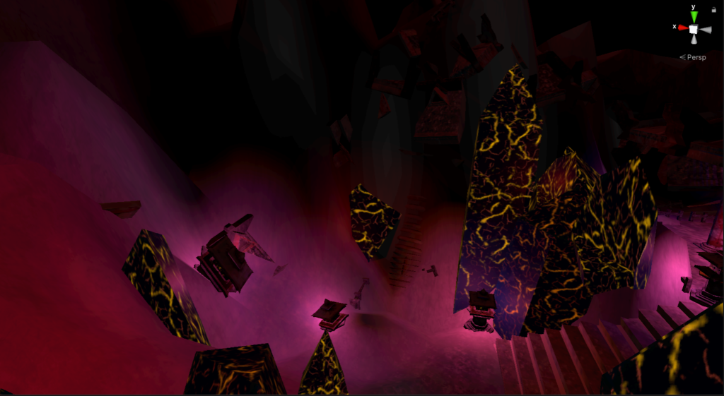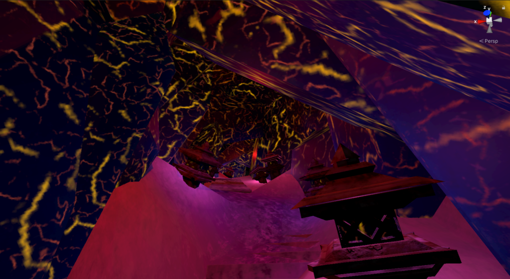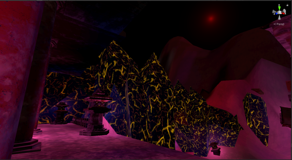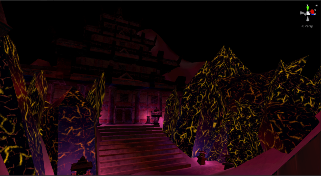 Here we can see two main parts, Sensoji’s Pagoda and the crystal cavern. You may recall in the original concept that the crystal “REIC” is the only thing that is keeping the remaining people on Earth alive without dying to the now very cold temperatures. Originally, my level design had two parts, a large evil bad guy building, this pagoda, and an ENTIRE city with it (plus a frozen). And due to heavy time restrictions, a lot of this was cut out. I compensated to add snow mountains instead (to show how snow has just continued to build) and at least show that some how a religious symbol has managed to survive while many modernized buildings may not (that was intended but you don’t see any buildings).