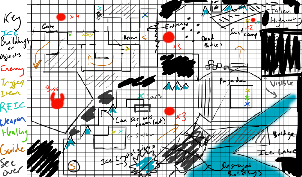 For the level design part, it consists of two parts, an outdoor enclosed city area, and an indoor building zone. The outdoor area is pretty big and sets the player at the bottom left of the map. The indoor area will consist of a couple of rooms where you could loot them if you so desire and eventually fight more mobs and the boss. There are also some areas of potential interest if the players decide to get close to them. Some notable spots are marked on the design map. They are generally optional to visit, as players can ignore and run past them, but they also award players with goodies if they decide to spend the time to look (obviously, it’s just going to be a one room place for this class, but if this was an actual game, we could see the player exploring the mini buildings.)