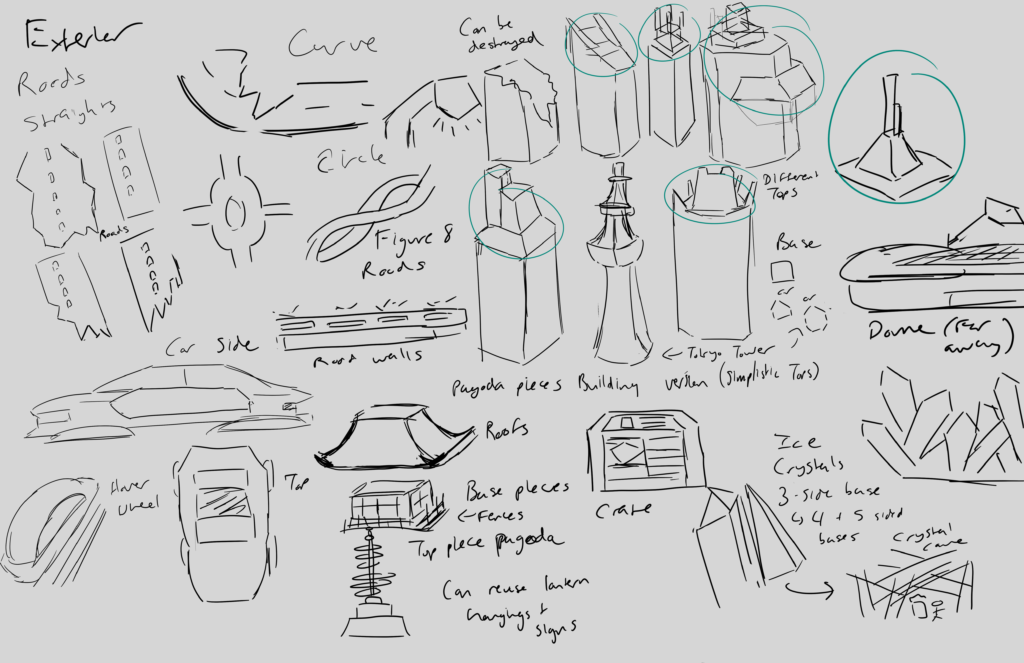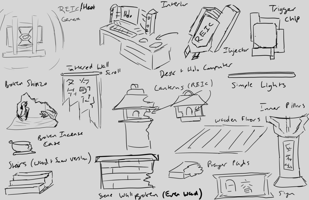 I decided in the end to ultimately include the first half of the area where the player runs towards a temple area. Main reason is I feel a larger outside level rather than inside will set the ambience better (and I don’t do well with interior planning). I have also redesigned the first area to include a crystal cave/destroyed buildings area to explore (its just another route to fight enemies). Cutting the map in half will help me since I can also make the zone a little larger. I never mentioned this but this will be set place in Tokyo.