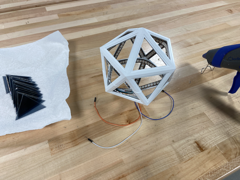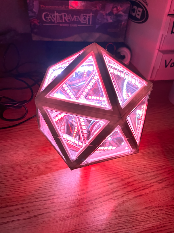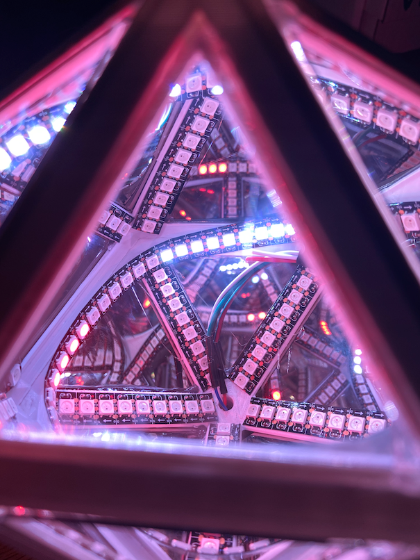 Luckily I ended up only cutting up 1 of my 2 LED strips, so I ended up wrapping the inside of the 2 large horizontal rings with the uncut LED strip, and then lines the other edges with the cut LED strip for purely ascetic purposes. Finally after assembling the two halves of the icosahedron, laser cutting the sides, and glueing the sides in I finished the first working prototype of the infinity icosahedron. For now I just have the same example code running from last week, however now that I finally have an idea on how they look inside the icosahedron I can work on recoding the visualizer to fit the current setup. Bellow I just have a couple images of it lighting up in tune with music.