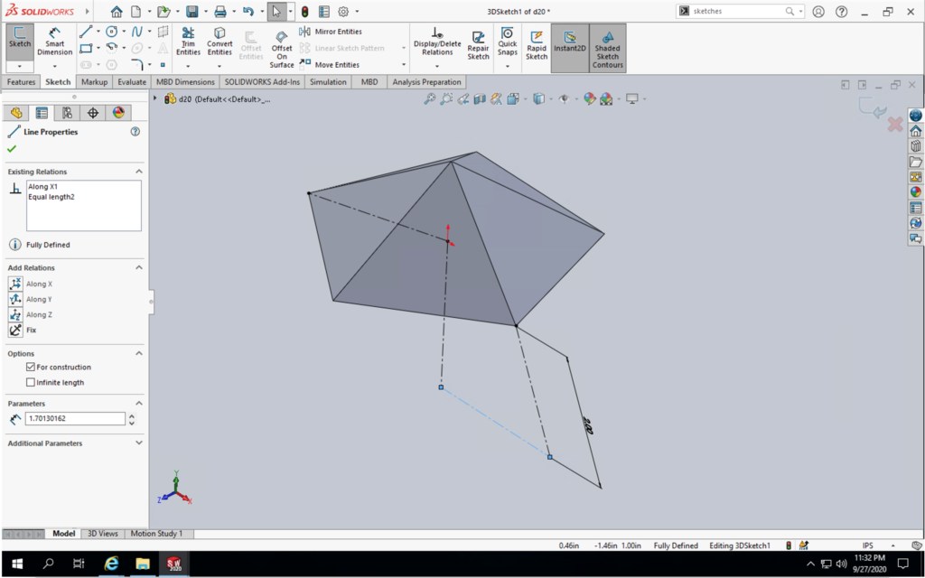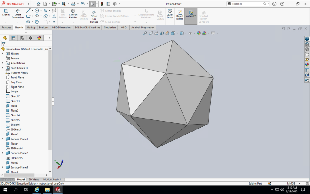 I started out by just jumping right into Solidworks without using it in over a year and tried to follow the first tutorial I found on how to make an icosahedron. As you can see by the first image on the right, I didn’t get very far until I was completely lost on how to continue following along. So I ended up spending a few hours going through some Solidworks tutorials to relearn the basic, and eventually came back to following a different tutorial and was able to successfully create the icosahedron. From here, I have an idea on how to hollow out the icosahedron as well as extrude triangles on each side to achieve an icosahedron equivalent frame as the infinity cube frame on the right. My friend who’s a Solidworks god agreed to come over and walk me through these steps for finishing the CAD model sometime after Monday’s lecture, so I should have the model finished by the end of today (Monday) and get my 3D printer printing 24/7.