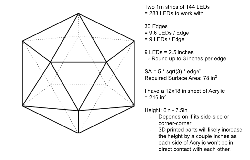 For planning the design of my infinity cube, I decided to base my calculations on making an infinity icosahedron (or in D&D terms: D20) as if I’m going to go the route of making a functional die for D&D it might as well be the most iconic die. This means that I will need to line the inside of 30 edges with LED strips in order to light up the whole object. In terms of resolution I personally wanted 10 LEDs per edge in order to have more control programmatically to create an interesting music visualizer using the icosahedron. This meant I’d need a total of 300 LEDs, however since LED strips come in 144 LEDs per 1 m, I ended up reducing the amount of LEDs per edge to 9 so that I could have enough LEDs with just two 1m strips. The required edge length and surface area can be seen in the figure bellow.