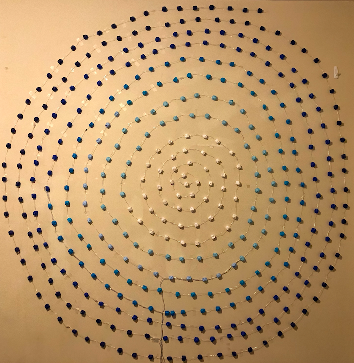 Over the course of the past seven weeks, I have developed a centerpiece that went through many iterations. Originally, I was inspired by a previous year’s final project to create an origami light mural that displayed a cohesive image. Through trial and error, I developed a more abstract design that looks much different than originally intended. This piece consists of 400 LED string lights arranged in a 7-foot diameter spiral, each of which is covered by a tiny origami balloon. These balloons vary in shades of blue and fade to white as it gets closer to the middle of the spiral.