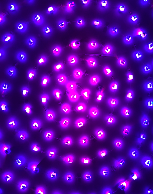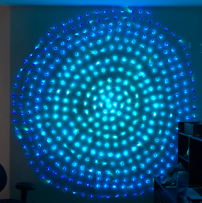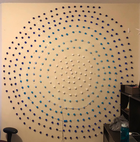 It was really this past week where I did the majority of the work on the project because I just finalized my design about six days ago. Looking back, I wish I had approached this smarter so I wouldn’t have to make so many origami balls (I only used 400) or order so many lights. Additionally, I began stringing the lights from the outside-in, which did not work out favorably when I got to the inside of the spiral. I also did not realize how much time it would take to mount to the wall, as it took several hours to make minor changes to make the shape more symmetrical. Overall, I am very happy with the way it turned out because I think it looks appealing with and without the LEDs.