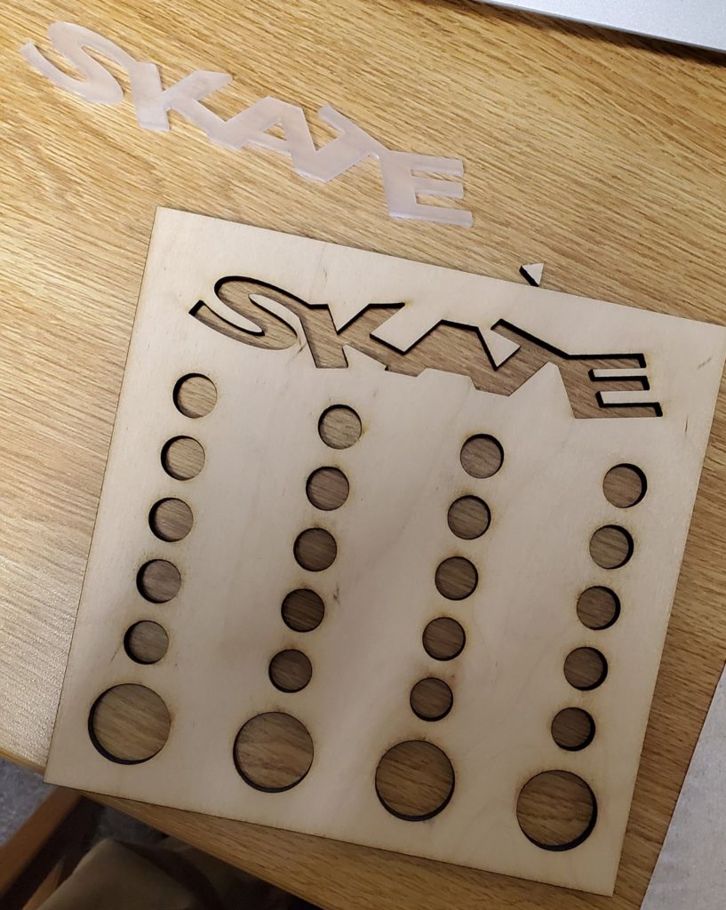 First, I decided to make a new front panel because it would have been easier than trying to properly align the title to holes. I went back to the laser cutter for the third time this term, and it wouldn’t be the last. There I made the new panel and an acrylic cut out to diffuse the light. I sanded one side of the acrylic to diffuse the light better.