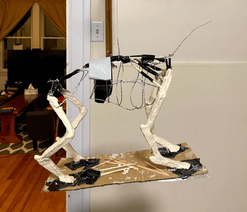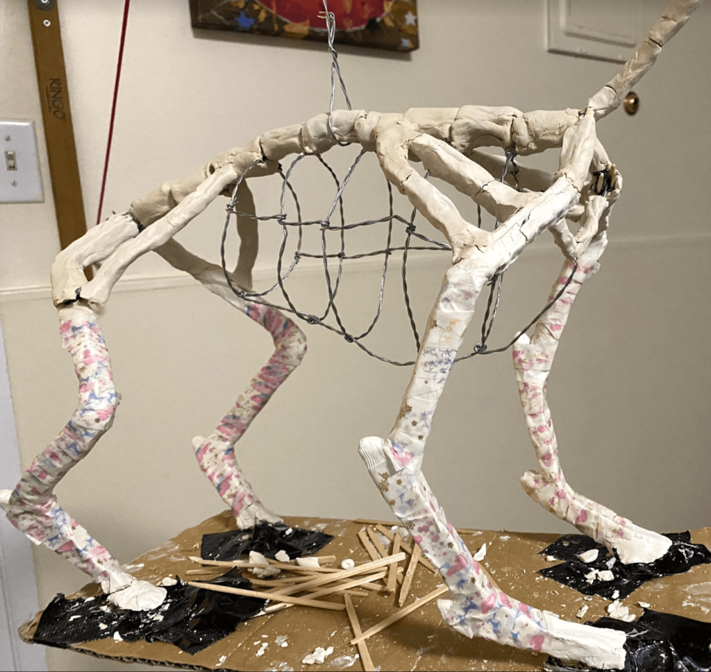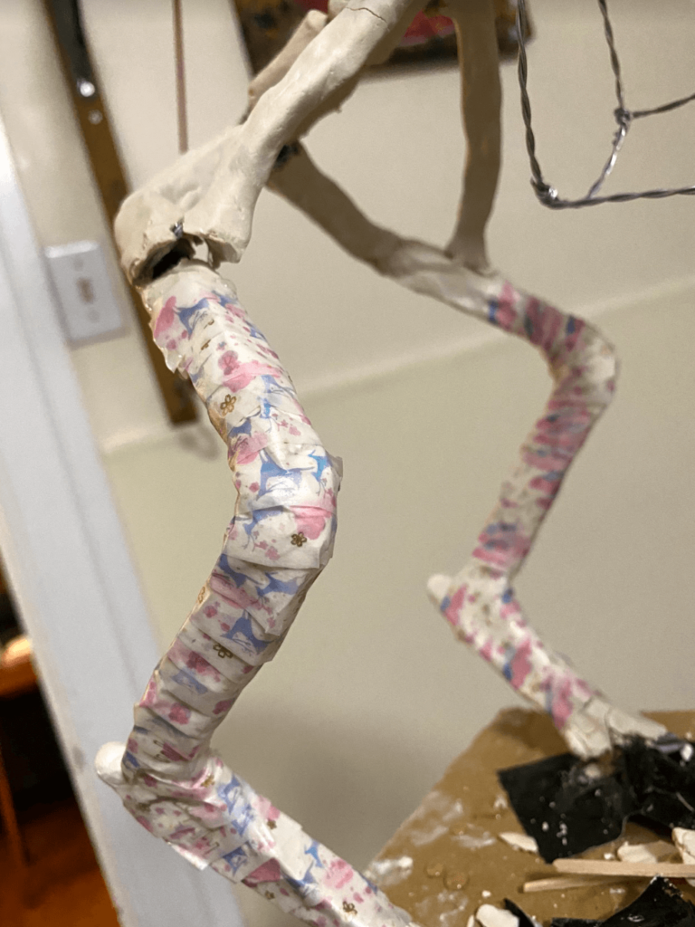 Wow, this was a disaster. I had planned to be nearly done for this assignment, with all the lights wired up to the sculpture; a mostly finished project. However, the nightmare that was creating a stable skeleton completely derailed my plans. With a basic wireframe made of doubled-up wire, duct tape, hot glue, and wood, I moved on to covering the sculpture with clay, trying to make a uniform, bone-white exterior. The clay had a dry-time of one day, so I had to wait to see how my creation would turn out.